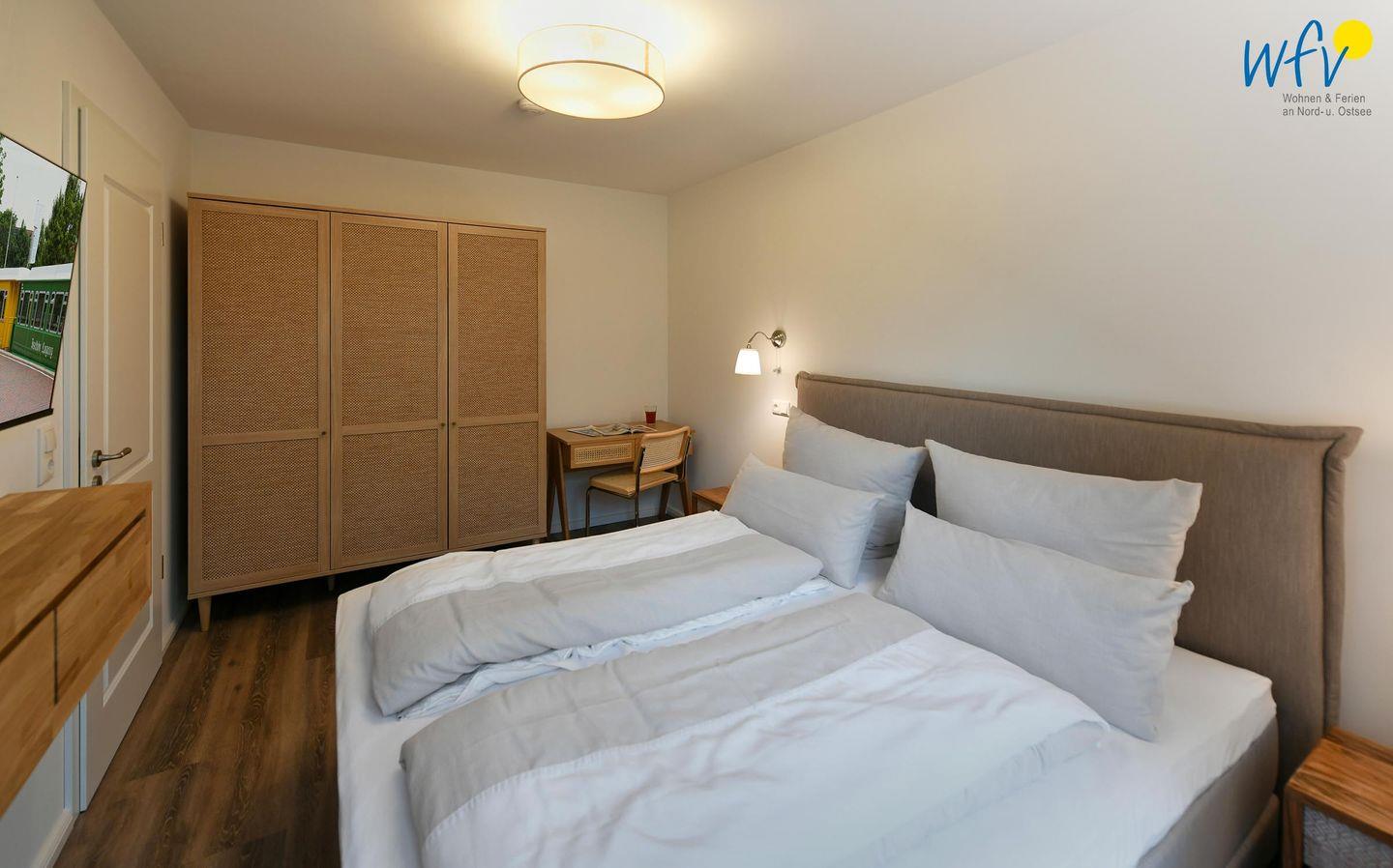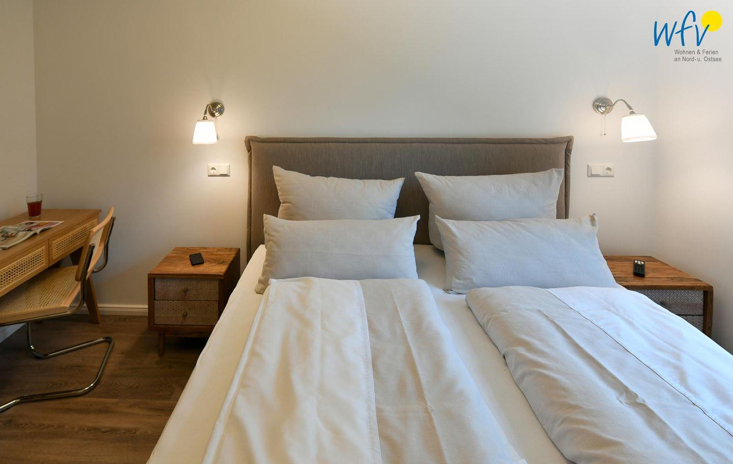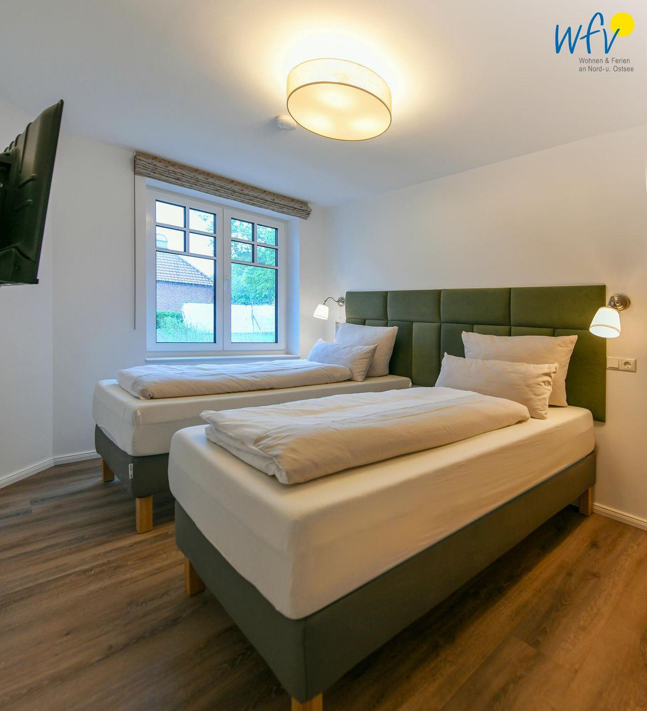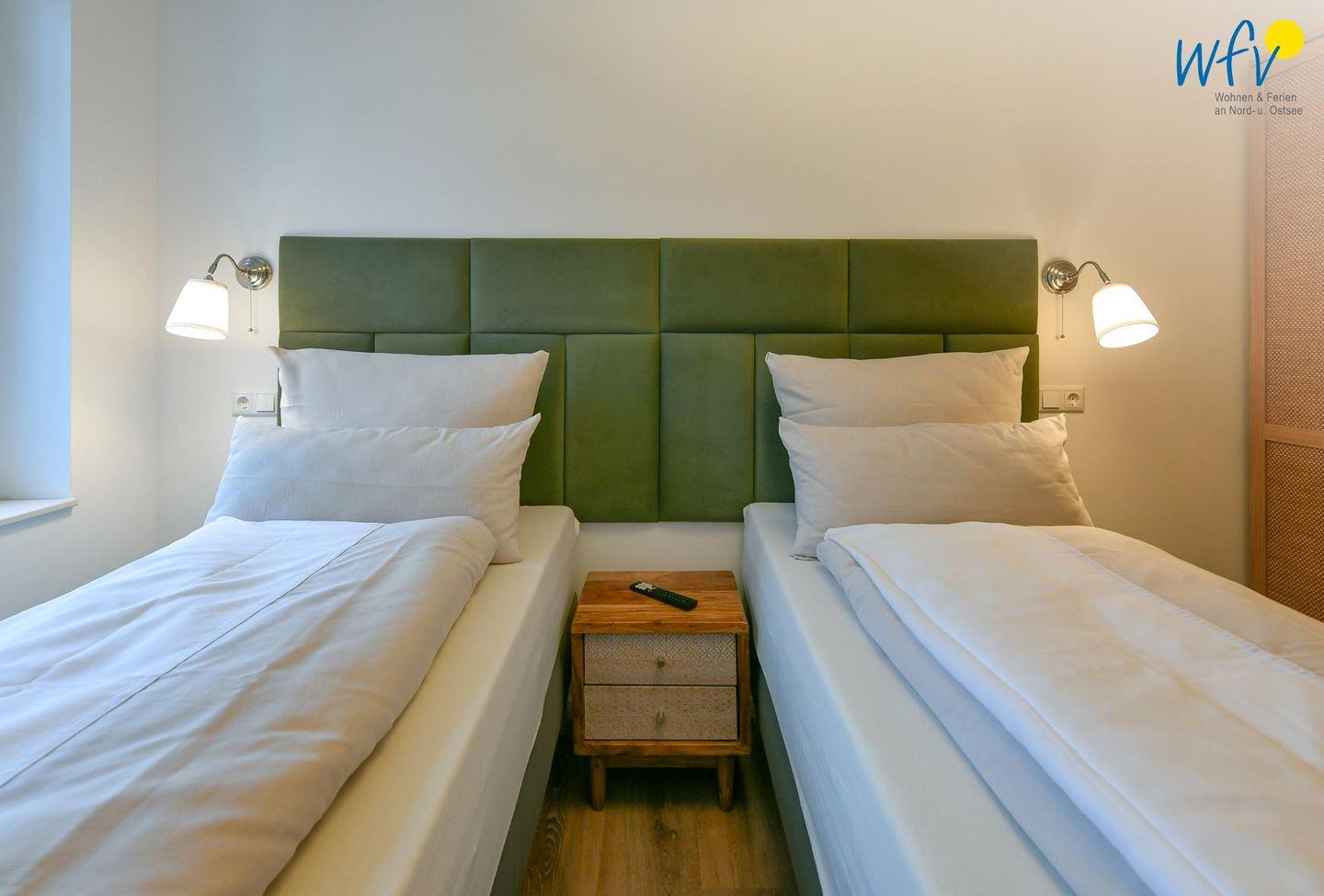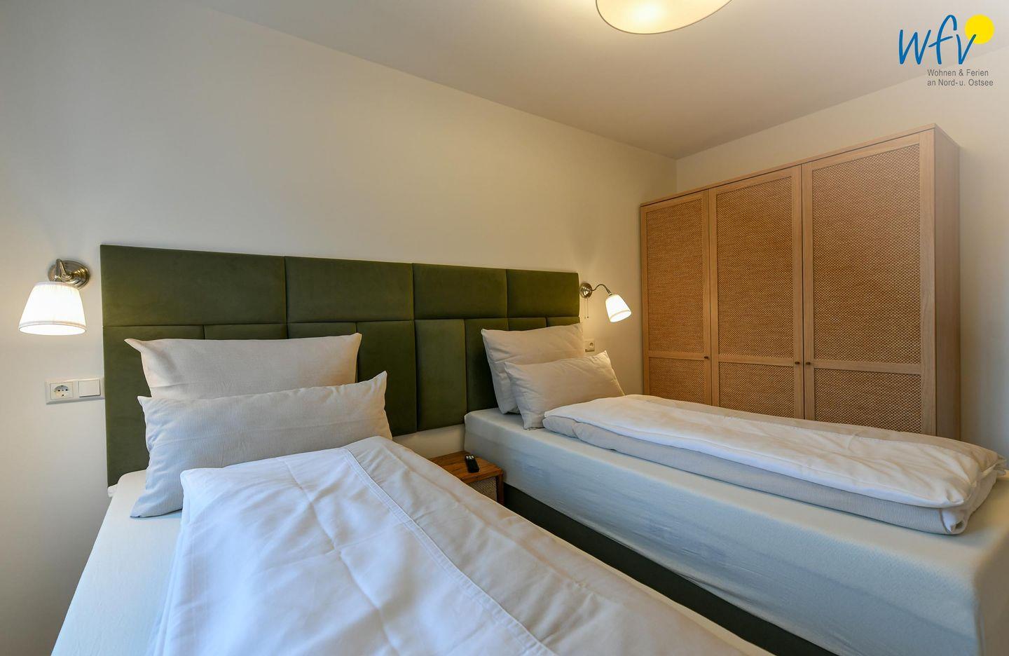 Die zwei separaten Schlafzimmer bieten Ihnen sowohl Komfort, als auch Privatsphäre. Ein Schlafzimmer ist mit einem komfortablen Kingsize-Boxspringbett ausgestattet, das zweite Schlafzimmer beinhaltet zwei Einzelbetten, die bei Bedarf auch zusammengeschoben werden können.