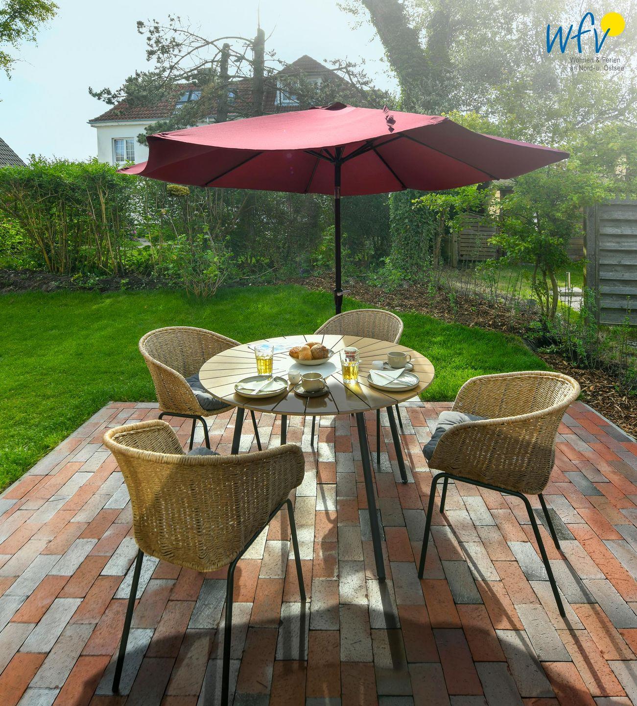 Das Bonbon der Ferienwohnung ist die große möblierte Terrasse mit Garten. Das beste Ambiente für Erholung bei frischer Meeresbrise - ein herrliches Urlaubsgefühl!