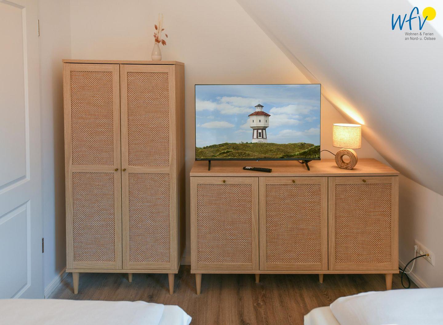 Die Maisonette-Ferienwohnung verfügt über ein modernes, offenes Wohnkonzept über zwei Etagen, das für ein weites Raumgefühl sorgt. Im Dachgeschoss sind Wohnbereich und Küche harmonisch miteinander verbunden, sodass Sie hier nach dem Strandtag oder der Fahrradtour gemütliche Abende auf dem bequemen Sofa verbringen, fernsehen und lesen können oder das gemeinsame Kochen genießen. Für kulinarische Erlebnisse ist die moderne Küche mit einem 4-Platten-Induktionsherd, einem Backofen, einer Mikrowelle, einem Kühlschrank mit Gefrierfach sowie einer Spülmaschine ausgestattet. Der angrenzende Essbereich lädt zu gemeinsamen Mahlzeiten ein.