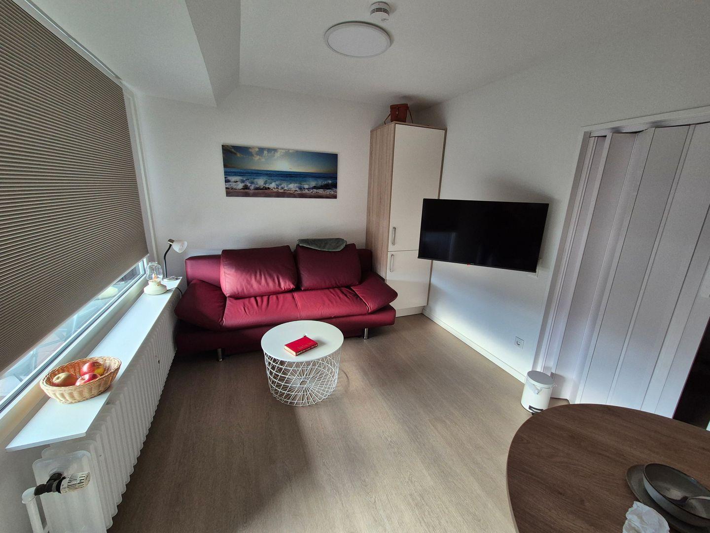 Das mit viele Liebe renovierte Appartement bietet einen kleinen Eingangsbereich, durch den Sie in den Wohn-Schlafbereich gelangen. Die toll integrierte Küche, linksseitig, ist mit allem ausgestattet. Der Wohnbereich, rechtsseitig mit der gemütlichen Couch, die zu Ihrem Schlafplatz umfunktionieren können, grenzt an die große Fensterfront mit Blick auf den schönen bestuhlten Balkon. Dieser bietet einen weiten Blick über Langeoog.