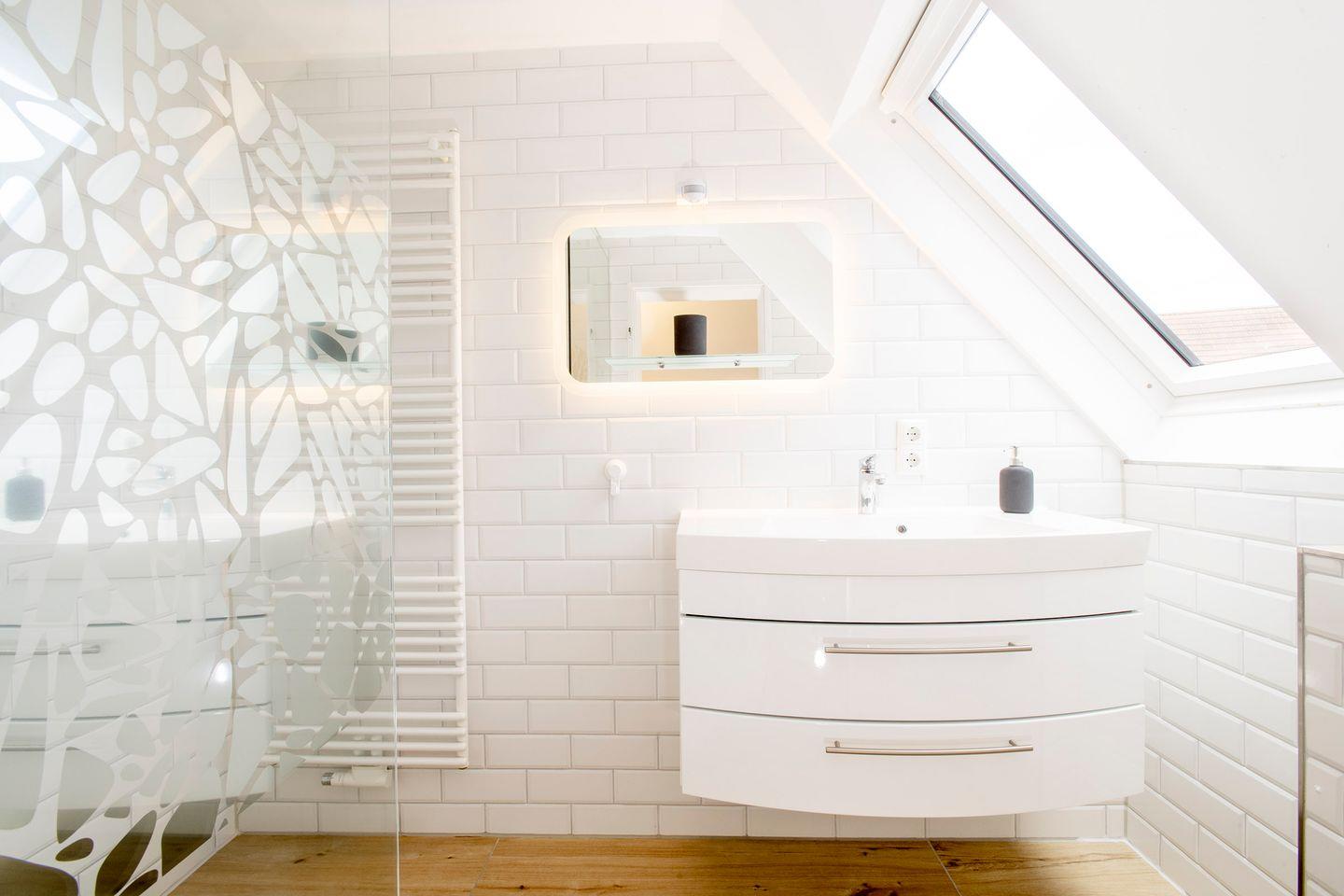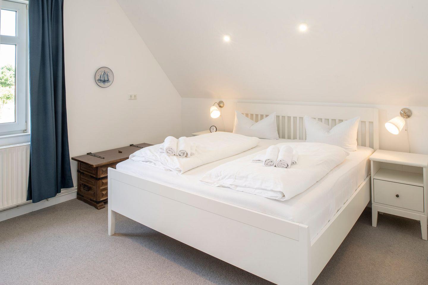 Auf halber Strecke der Treppe nach oben finden Sie das Bad mit bodengleicher Dusche, Waschtisch und WC. Von hieraus erreichen Sie nach wenigen Stufen den Wohnbereich mit der super ausgestatteten großen offenen Küche - das gemütliche Wohnzimmer mit dem Essplatz am Fenster. Die Schlafzimmer haben beide ein Doppelbett. Das Einzelbett für den 5ten Schlafplatz steht in einem Durchgangszimmer, dass zur Gästetoilette mit einem zusätzlichen Waschtisch führt.