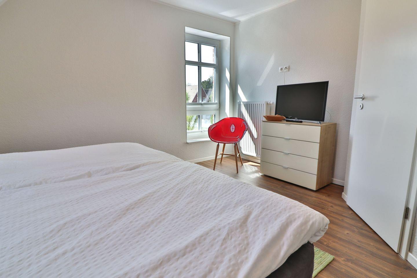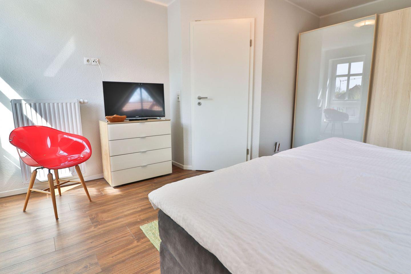 Zwei der drei Schlafzimmer sind mit Doppelbetten ausgestattet, das dritte enthält zwei Einzelbetten. In alle Schlafzimmer finden Sie hochwertige Boxspringbetten sowie Kleiderschränke und Kommoden für Ihre persönlichen Dinge, in beiden Doppelzimmern ebenfalls Fernseher für zusätzlichen Komfort. Die Verdunkelung erfolgt über Plissees für einen erholsamen Schlaf.