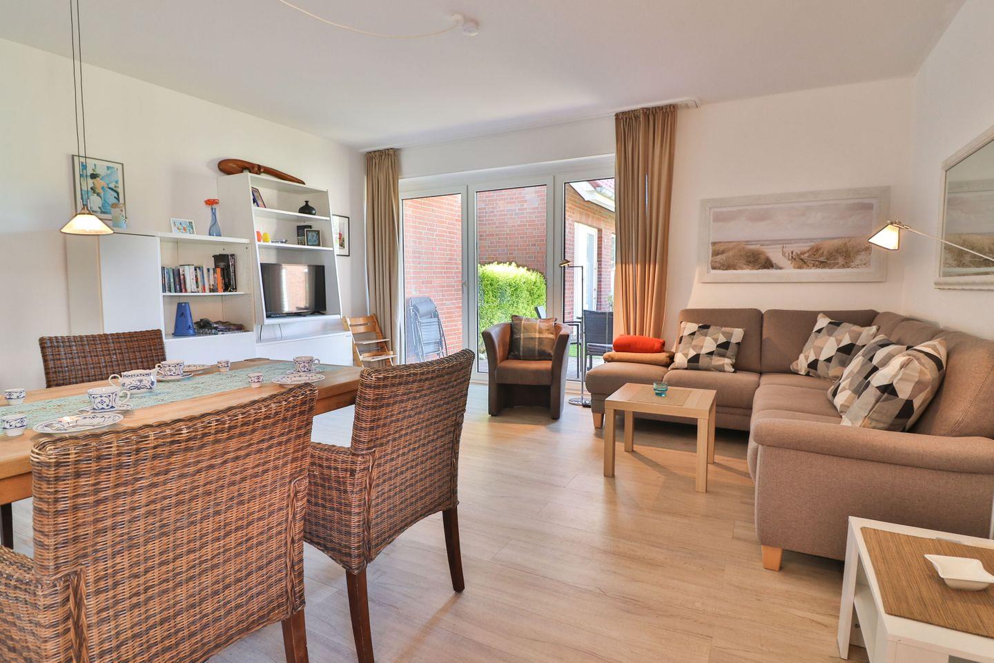 Ein besonderes Highlight dieser Wohnung ist die überdachte Terrasse mit Gartenmöbeln und direktem Zugang zum Garten hinter dem Haus, der zum Verweilen im Freien einlädt und entspannte Momente bei schönem Inselwetter bietet.