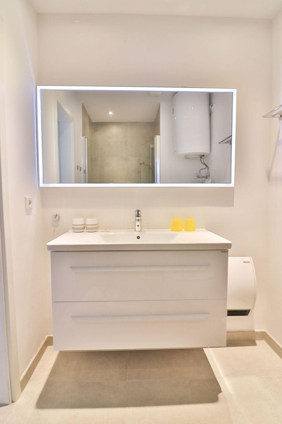 Das moderne Badezimmer ist hell und verfügt über eine bodengleiche Dusche, Waschbecken, Haartrockner, Spiegel und WC.