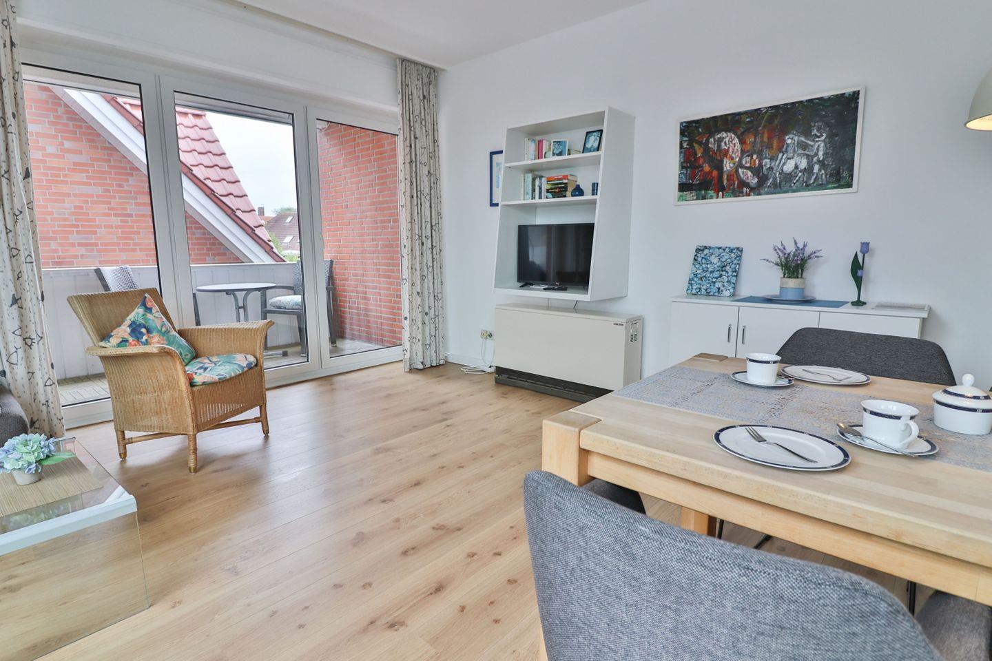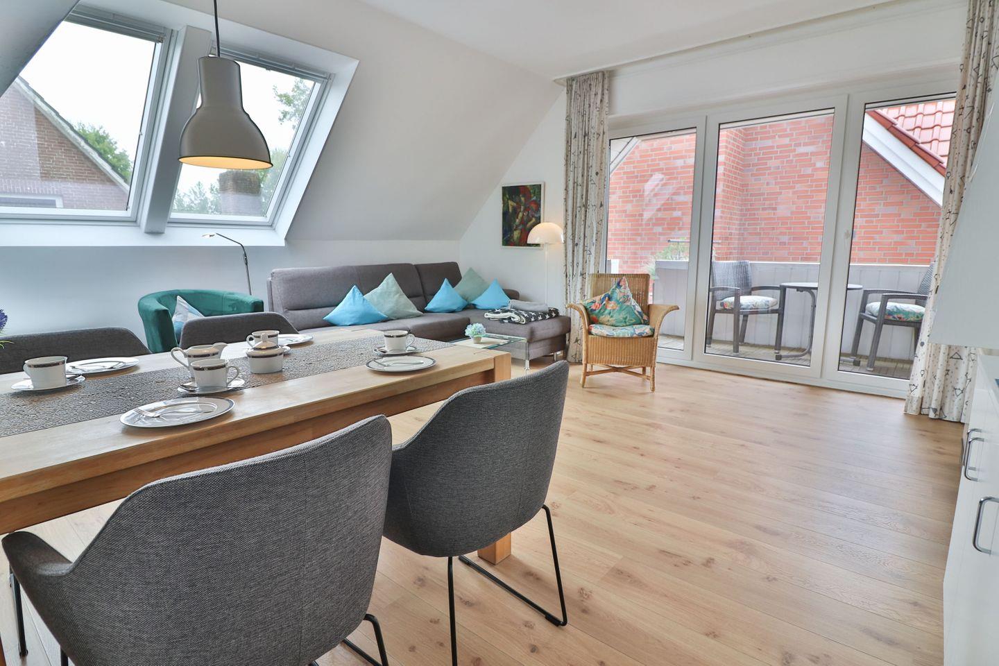 Komfortable Wohnung auf Langeoog mit Balkon, WLAN und moderner Ausstattung für erholsame Ferien.