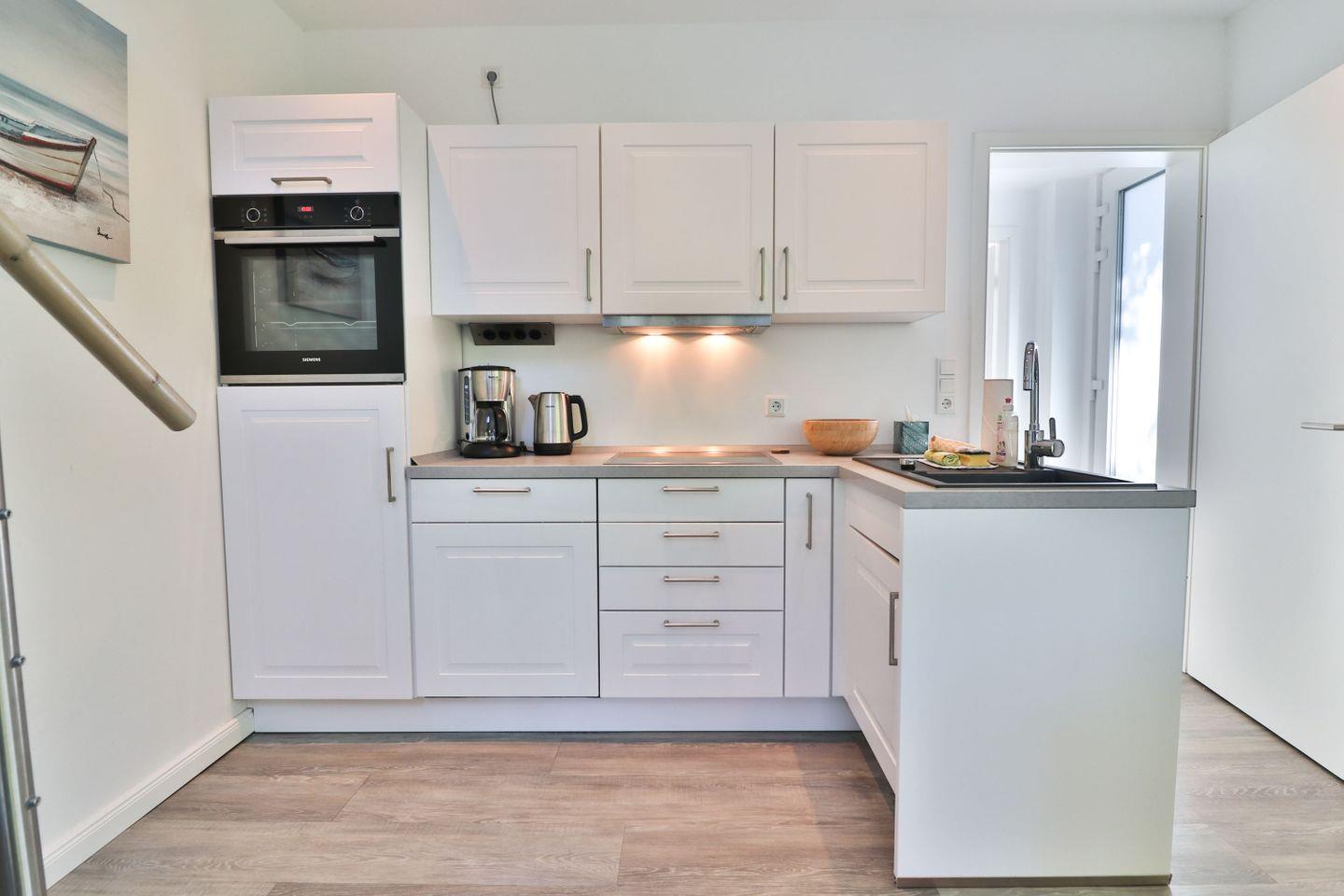 Die moderne, offen integrierte Küchenzeile ist voll ausgestattet und lässt keine Wünsche offen: Ein Cerankochfeld, ein Backofen in angenehmer Höhe, eine Spülmaschine, ein Kühlschrank sowie Kaffeemaschine, Wasserkocher und sämtliche Küchenutensilien sorgen für Komfort und Unabhängigkeit während Ihres Aufenthalts.