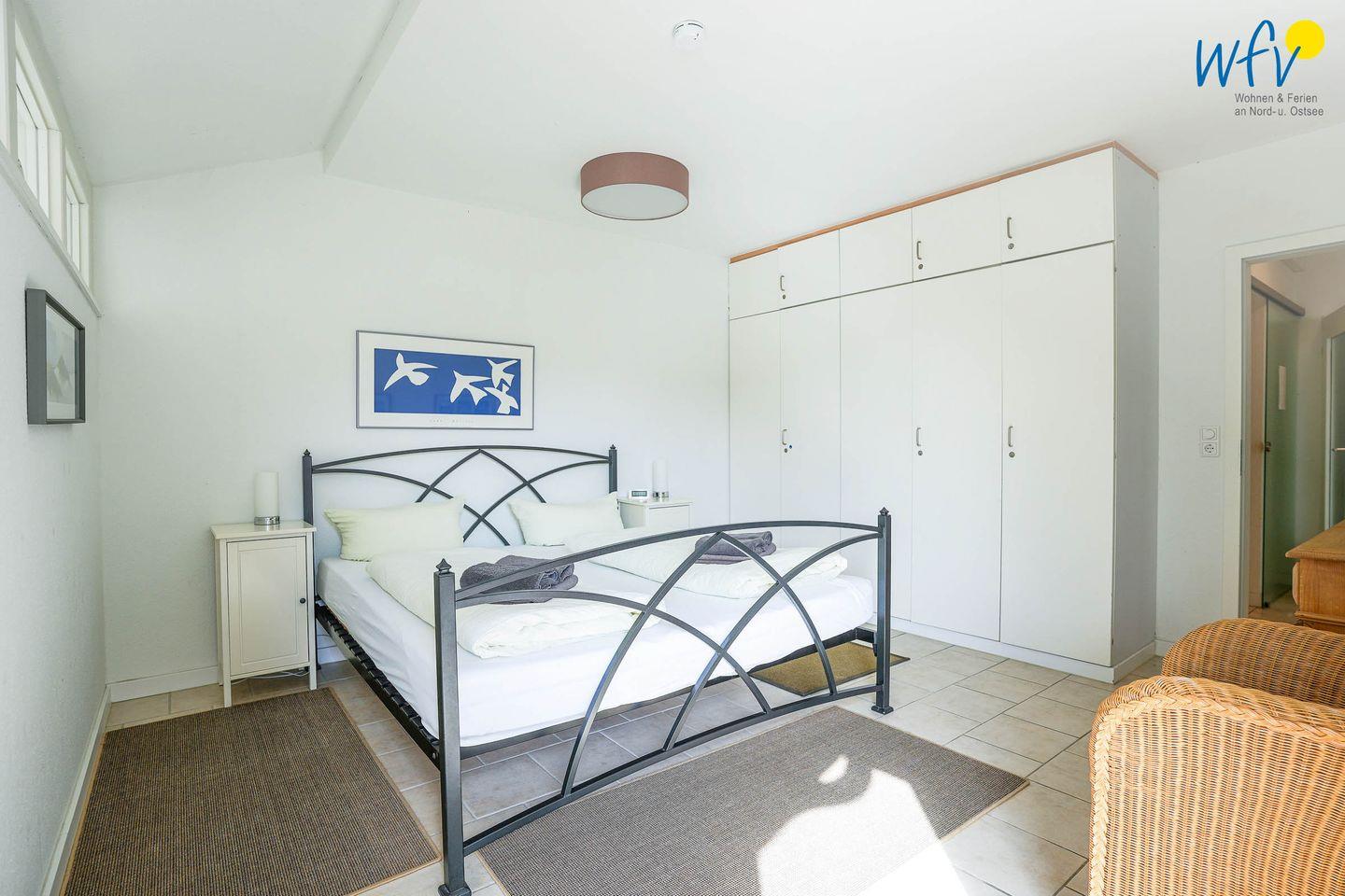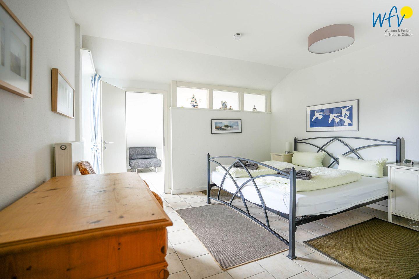 Zwei separate Schlafzimmer bieten Ihnen angenehme Rückzugsmöglichkeiten. Das Elternschlafzimmer ist mit einem Doppelbett (180 x 200 cm), 2 Nachttischen sowie einer großen Schrankwand eingerichtet. Von dort haben Sie Zugang zum Balkon und zum zweiten Schlafzimmer, dem Kinderzimmer - ebenfalls mit Zugang zum Balkon. Mit seinen freundlichen, weißen Möbeln, einem kleinen Doppelbett (160 x 200 cm) sowie einigen Spielsachen sorgt es dafür, dass sich unsere kleinen Gäste auf Anhieb zu Hause fühlen. Auch ein Kinderbett, eine Wickelauflage und ein Hochstuhl gehören in unserer familienfreundlichen "Ferienwohnung Kiebitzkoje" zum festen Inventar.