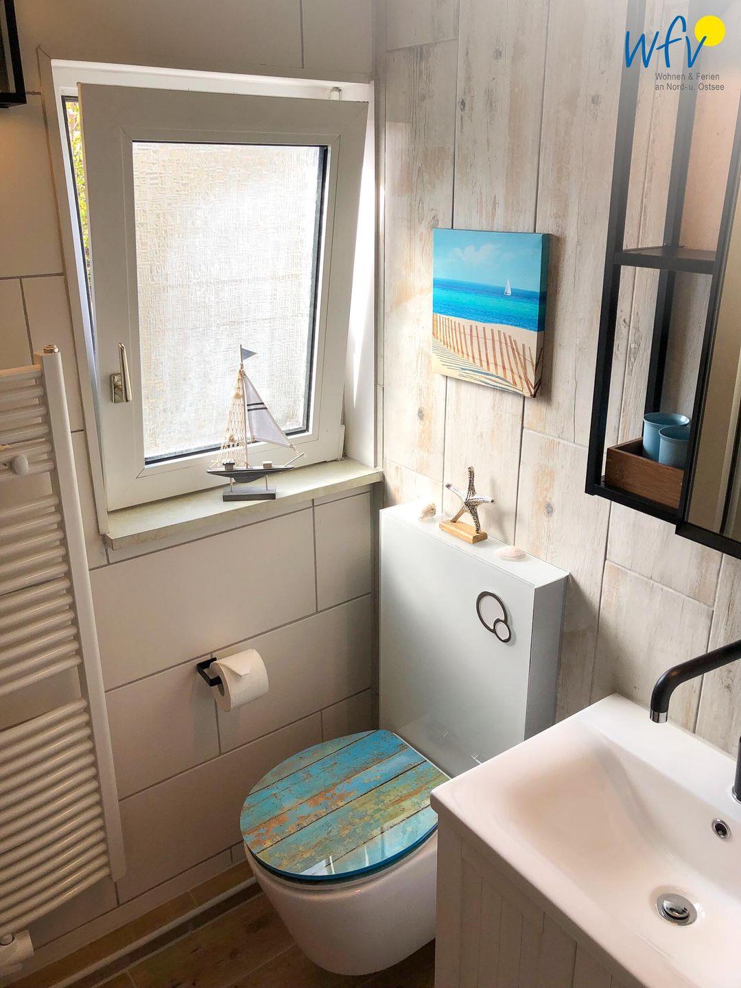 Die erfrischende Dusche nach dem Strandtag genießen Sie im kleinen, aber komfortablen Tageslichtbad mit Handtuchheizung, Föhn und Waschtisch. Auch diesem Raum verleiht die charmante und maritime Einrichtung ein besonderes Urlaubsflair.