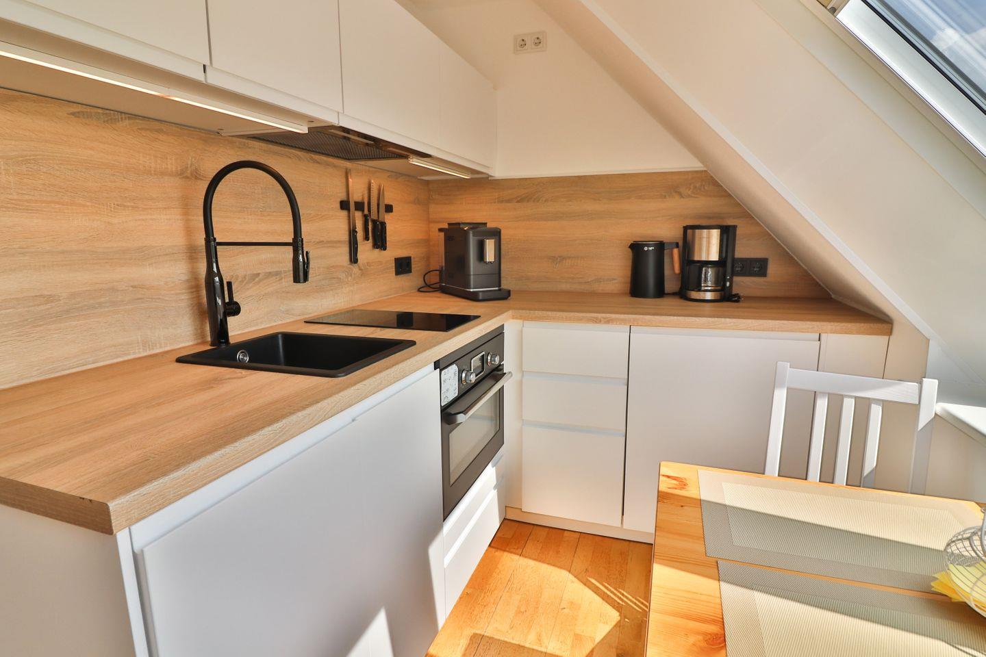 In der kleinen, aber gut ausgestatteten Küche mit gemütlichem Essplatz finden Sie alles, was Sie für eine komfortable Selbstversorgung brauchen: ein Ceranfeld, ein praktisches Kombigerät aus Backofen und Mikrowelle, eine Spülmaschine, Kühlschrank, Kaffeemaschine, Wasserkocher und viele weitere hilfreiche Küchenutensilien.