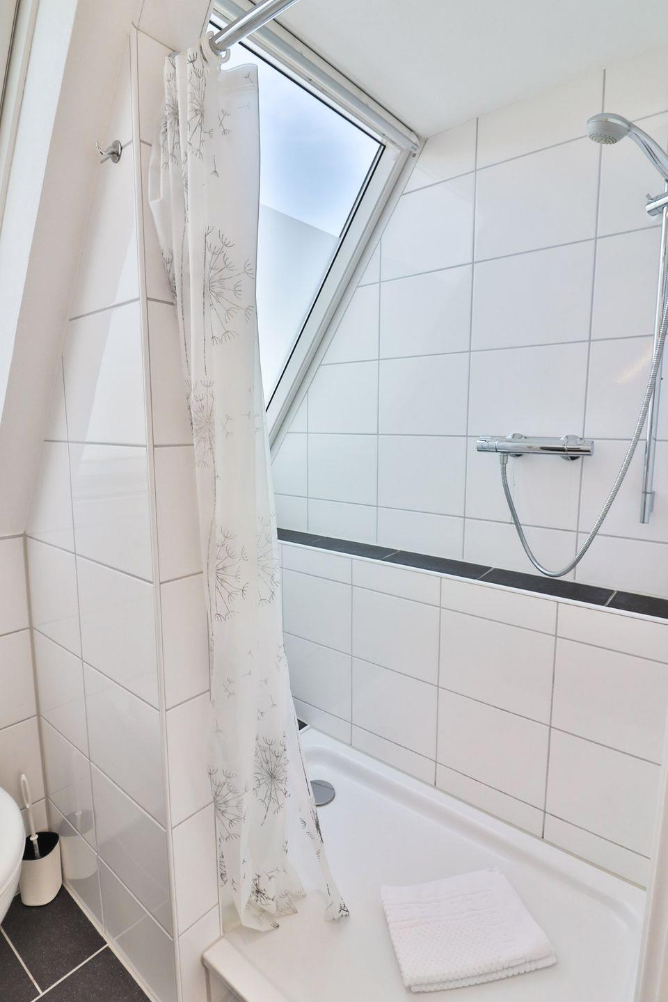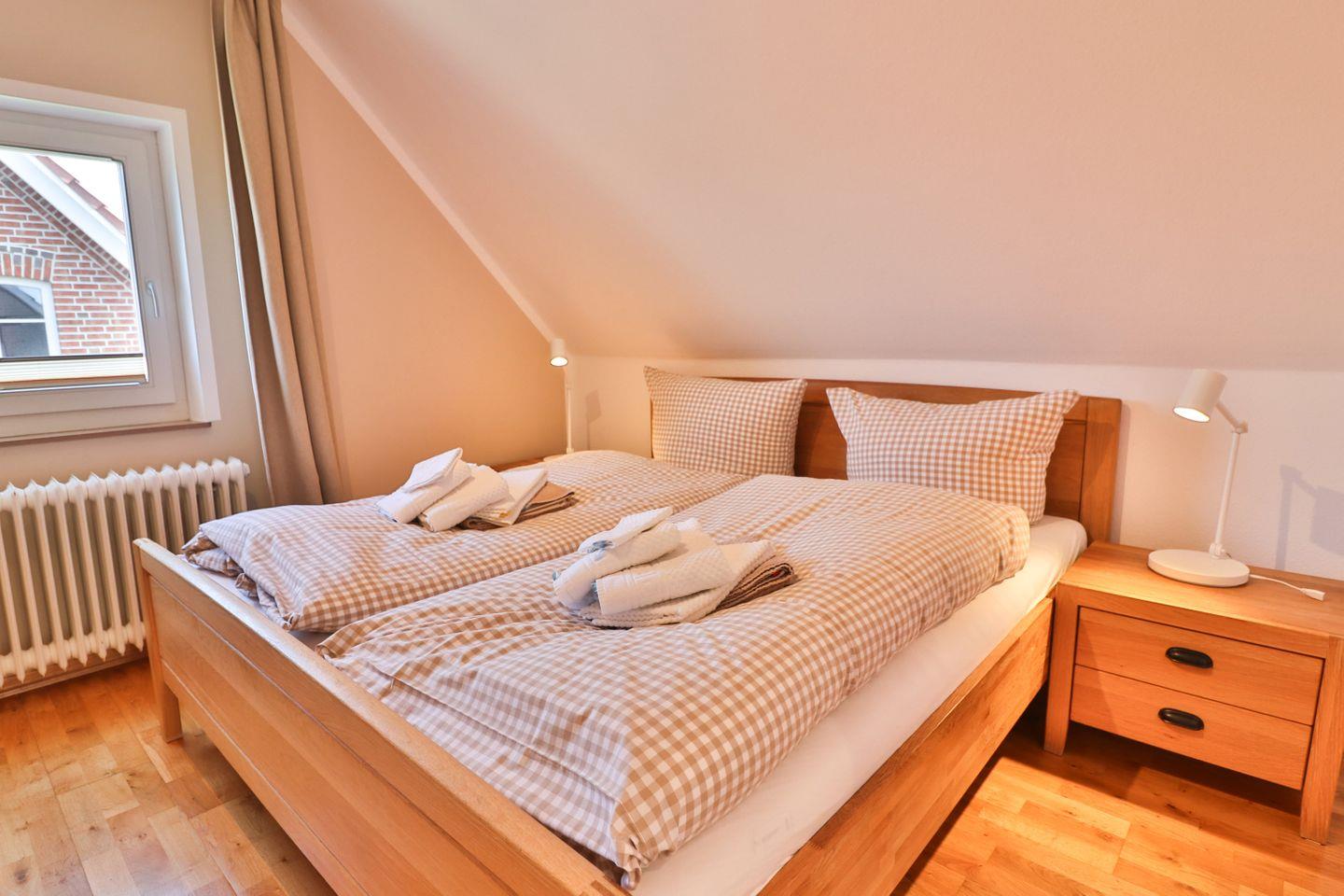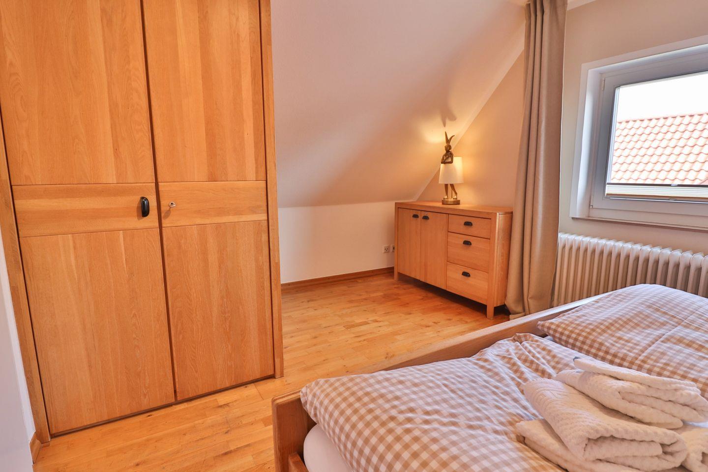 Das Schlafzimmer ist mit einem gemütlichen Doppelbett (180x200 cm), einem Kleiderschrank und Verdunkelungsvorhängen ausgestattet – für erholsame Nächte nach langen Inselspaziergängen. Das Badezimmer verfügt über Dusche, WC und Waschbecken.