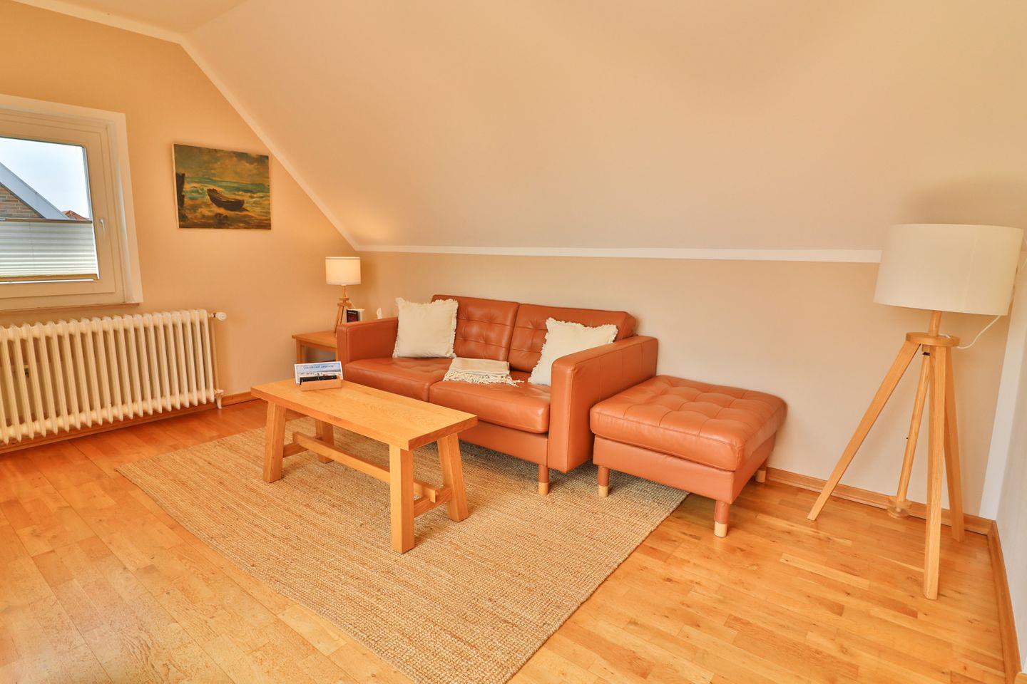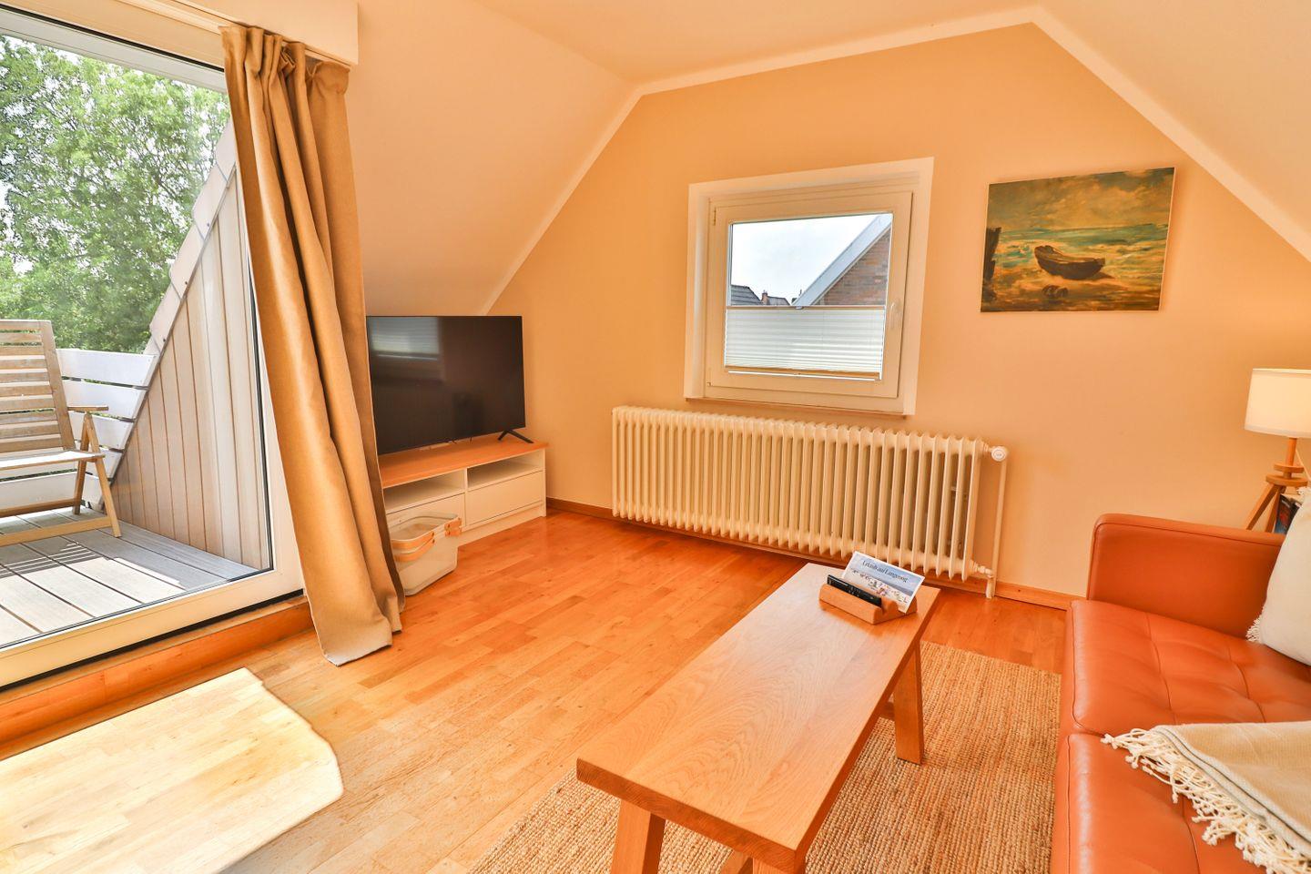 Das Wohnzimmer empfängt Sie mit einem bequemen Sofa, einem Fernseher und direktem Zugang zum kleinen Balkon, der in südlicher Richtung liegt. Hier genießen Sie Sonne und frische Nordseeluft – ideal zum Frühstücken, Lesen oder einfach zum Seele-baumeln-Lassen. Der Blick über die Dächer der Insel verleiht dem „Utkiek“ seinen ganz besonderen Reiz.