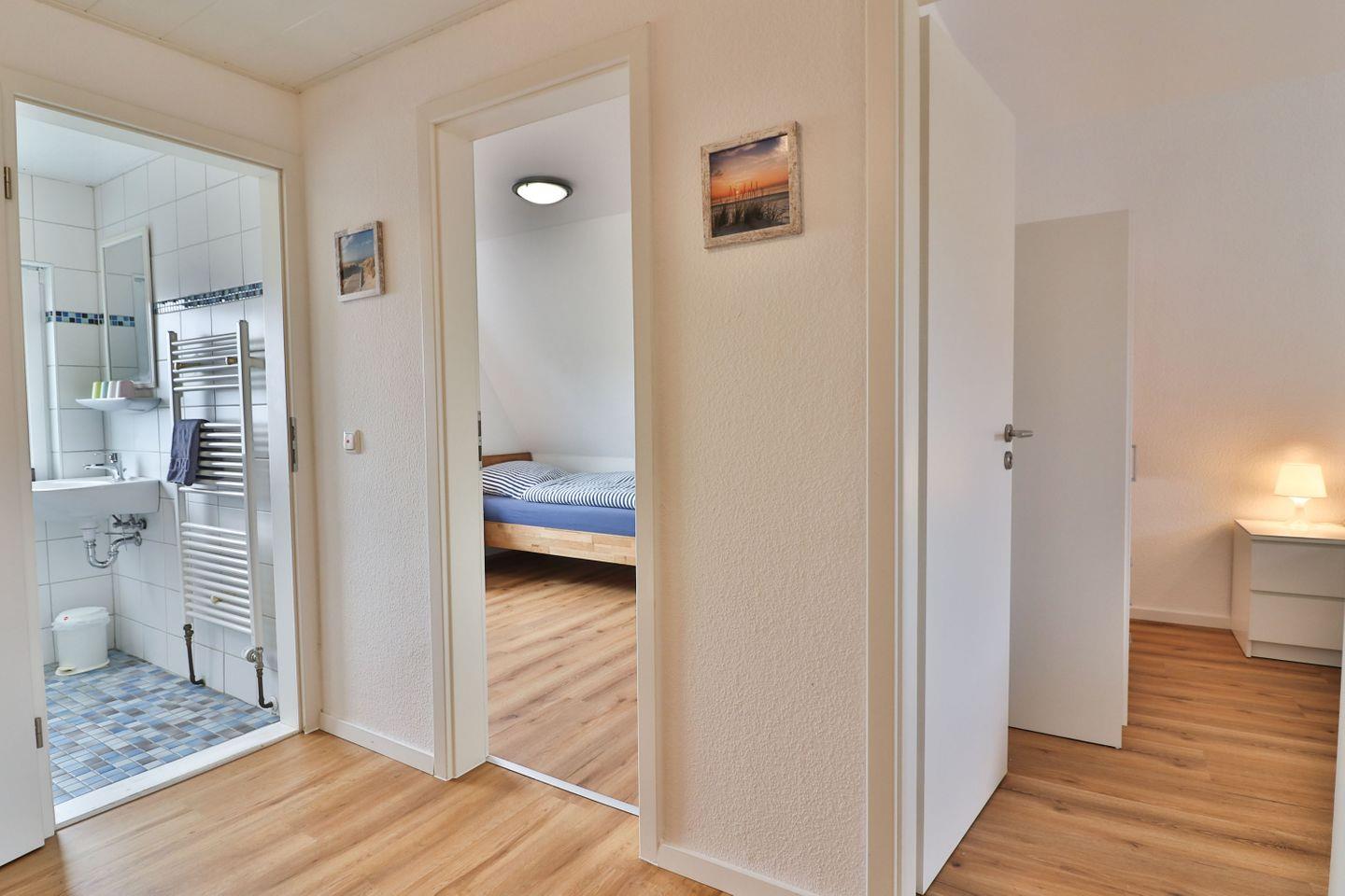 Im Obergeschoss erwarten Sie drei weitere Schlafzimmer: zwei mit je einem Einzelbett (90?x?200?cm) und Stauraum in Kleiderschrank oder Kommode, sowie ein großzügiges Schlafzimmer mit einem Doppelbett (180?x?200?cm) und Kleiderschrank. Ein zweites Badezimmer mit Dusche, WC und Waschbecken sorgt für zusätzlichen Komfort.