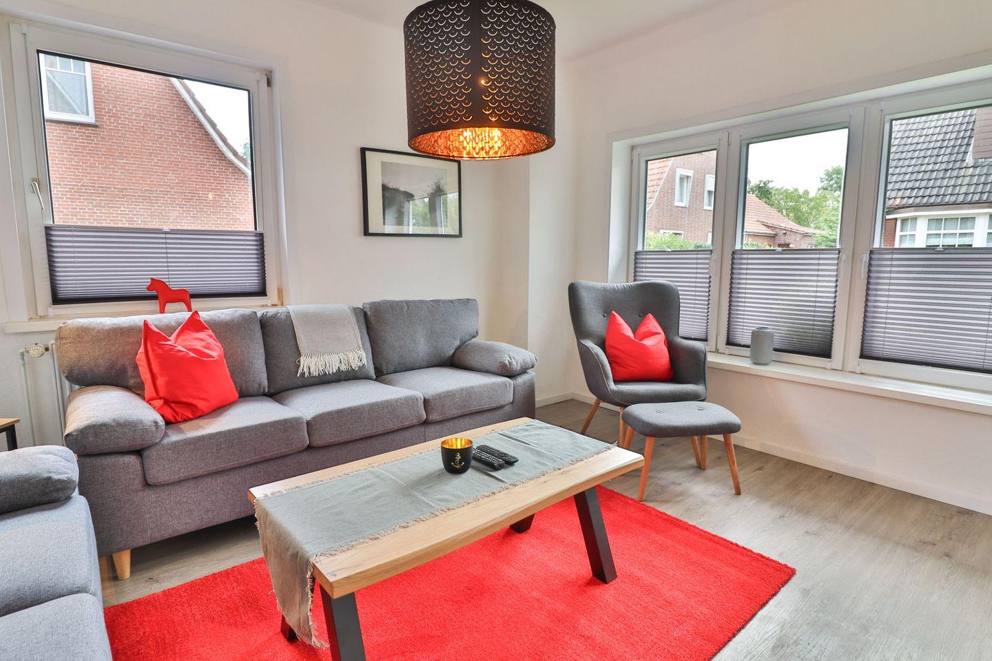 Die Maisonette-Wohnung erstreckt sich über zwei Etagen und verbindet modernen Komfort mit einer behaglichen Atmosphäre. Im Erdgeschoss erwartet Sie ein einladendes Wohnzimmer mit Fernseher – perfekt für entspannte Abende. Die voll ausgestattete Küche mit Herd, Mikrowelle, Spülmaschine, Kühlschrank, Kaffeemaschine, Senseo-Kaffeemaschine, Wasserkocher und Toaster lässt keine Wünsche offen. Direkt angrenzend befindet sich der helle Essbereich, von dem aus Sie Zugang zur möblierten Terrasse mit Tisch, Stühlen und Sonnenschirm haben – ideal für ein Frühstück an der frischen Nordseeluft.