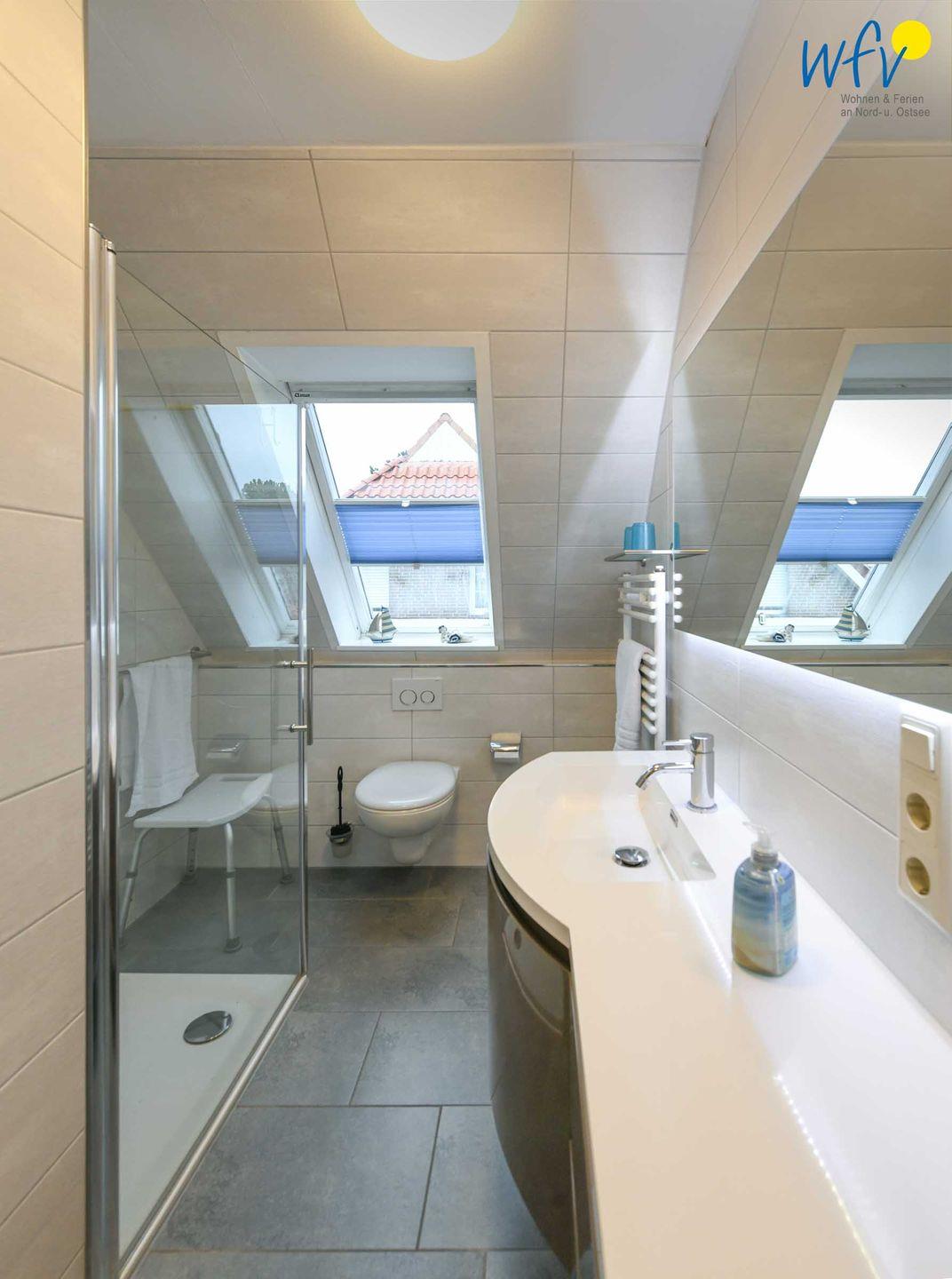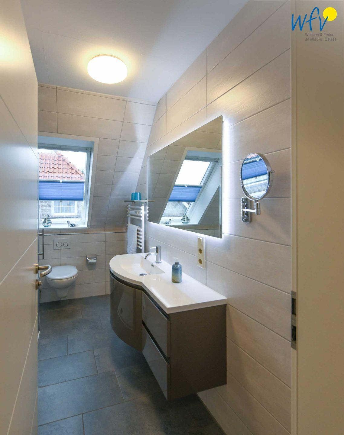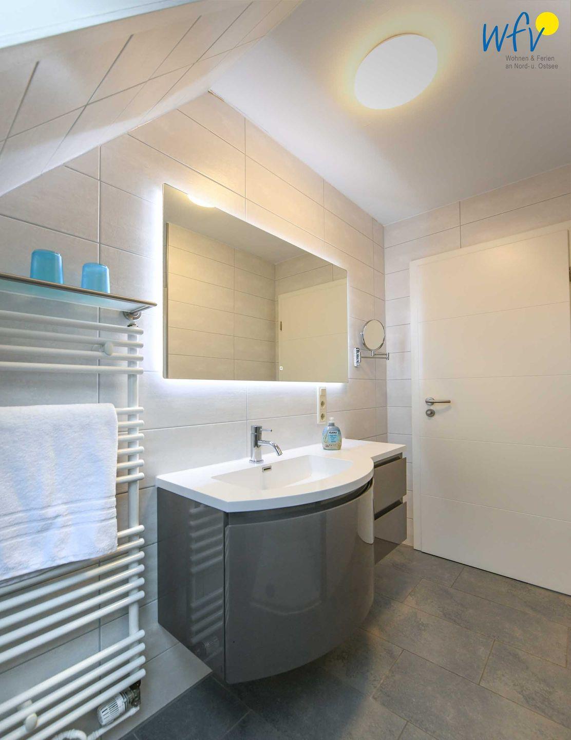 Weiterer Wohnkomfort erwartet Sie in dem eleganten Tageslichtbad mit ebenerdiger Dusche, breitem Waschtisch, Spiegel und Kosmetikspiegel sowie Handtuchheizung und Föhn.