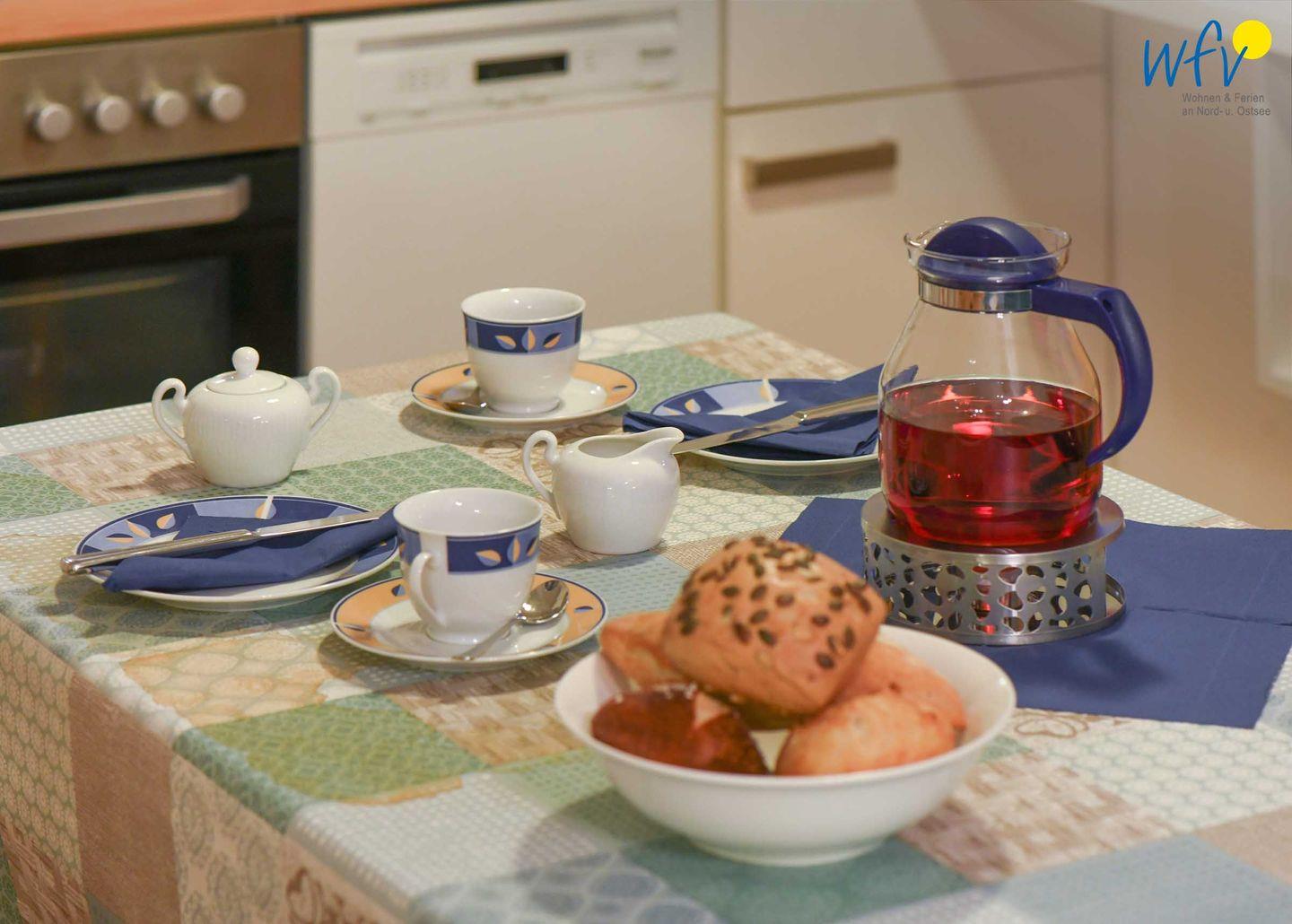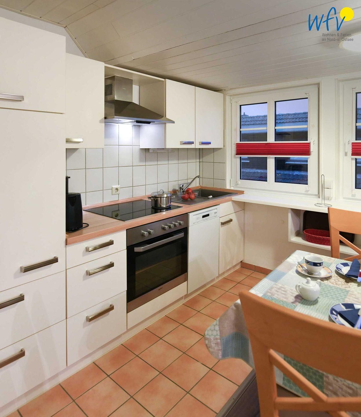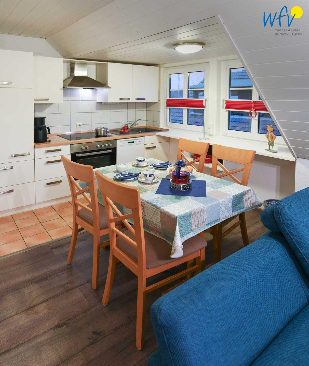 Für warme Frühstücksbrötchen, den Snack zwischendurch oder das leckere Abendessen ist die offene Küche komplett ausgestattet. Sie verfügt u.a. über einen Vier-Platten-Ceranherd mit Backofen, eine Mikrowelle und einen Geschirrspüler sowie über diverse Kleingeräte. Ihre Mahlzeiten können Sie an dem Esstisch im Wohnraum einnehmen.