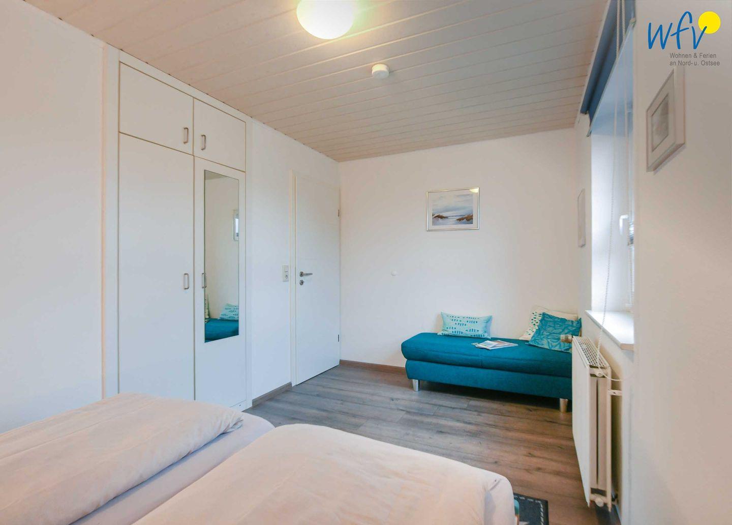 Das freundlich eingerichtete separate Schlafzimmer ist mit einem kleinen Doppelbett (je 80 x 200 cm) und einer Couch ausgestattet. Ein geräumiger Kleiderschrank bietet Platz für die Urlaubsgarderobe.