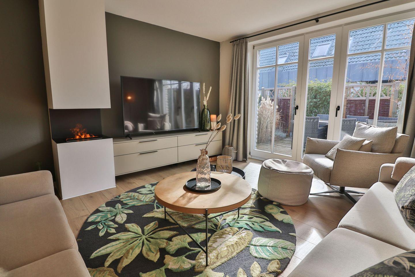 Im Mittelpunkt steht der gemütliche und stilvoll eingerichtete Wohnbereich mit Sofaecke, Sessel und extra großem Fernseher. Hier können Sie nach einem langen Strandtag entspannen und den Abend mit einem guten Buch oder in geselliger Runde bei einem Glas Wein ausklingen lassen. Der Wasserdampf-Kamin sorgt zusätzlich für stimmungsvolles Ambiente. Für Ihre Unterhaltung stehen insgesamt vier TVs zur Verfügung, zudem sind Sie über kostenloses WLAN stets gut vernetzt. Vom Wohnzimmer gelangen Sie auf die geschützte Terrasse, die hier Ihren Wohnraum nach draußen erweitert; Gartenmöbel und ein Sonnenschirm stehen bereit, um die Zeit bei bestem Wetter und guter Nordseeluft zu genießen.