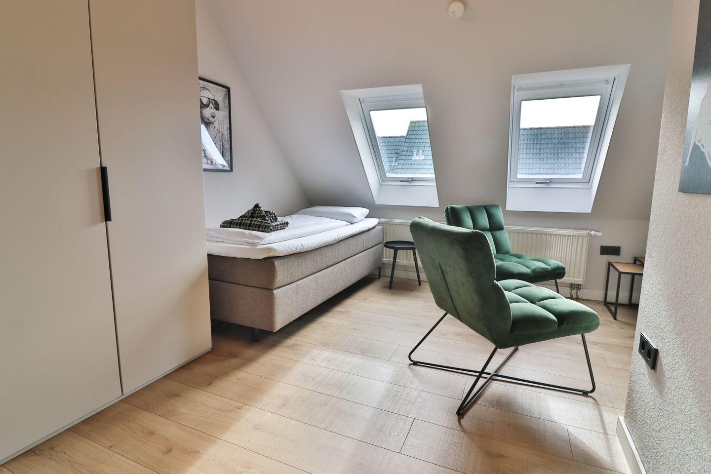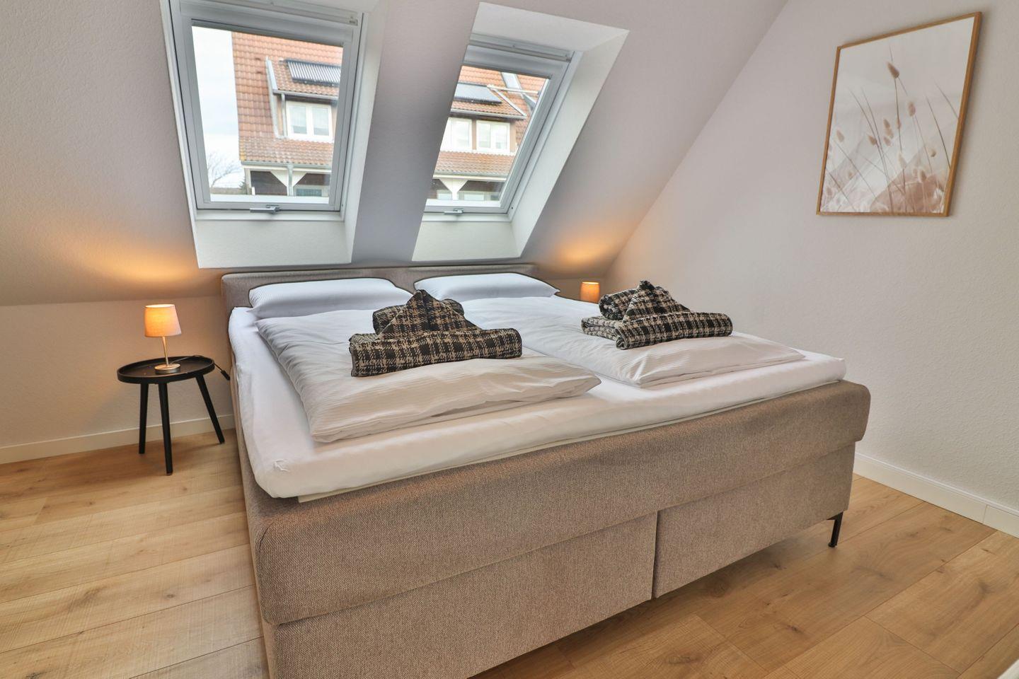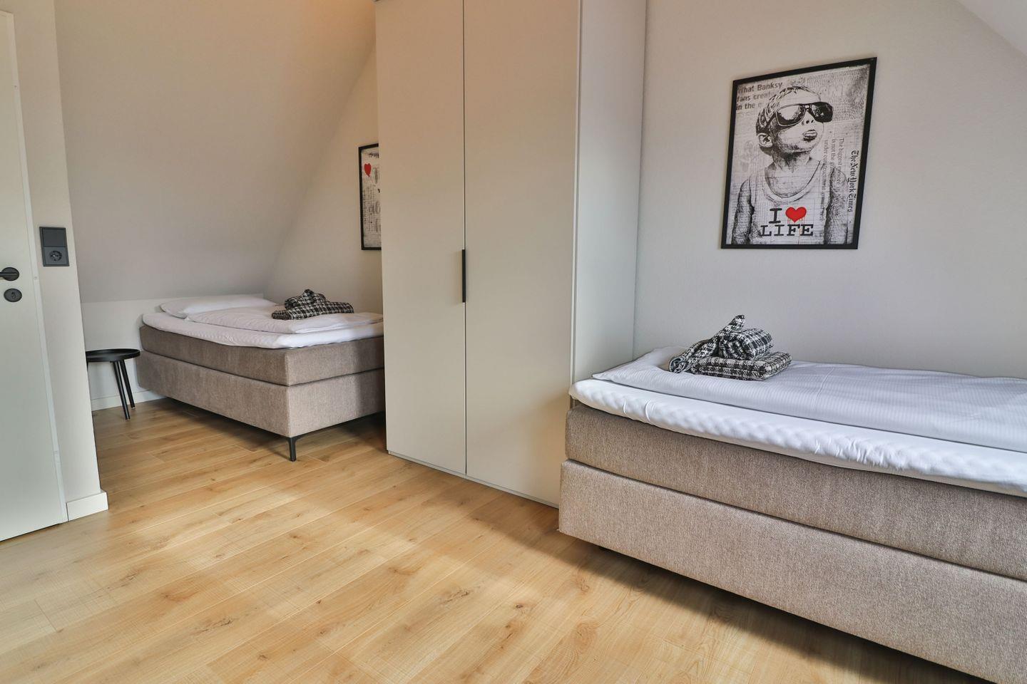 Alle drei Schlafzimmer befinden sich in den oberen Etagen und sind mit komfortablen Boxspringbetten für erholsame Urlaubsnächte ausgestattet. In jedem Schlafzimmer gibt es außerdem einen Fernseher sowie einen Kleiderschrank mit viel Stauraum für Ihre persönlichen Gegenstände. Zwei große Doppelbetten (je 180 x 200 cm) in den Schlafzimmern der ersten Etage sowie zwei Einzelbetten (je 100 x 195 cm) im Dachgeschoss erwarten Sie. Eines der Schlafzimmer hat zudem einen eigenen kleinen Balkon, auf dem Sie in Ruhe bei einer Tasse Kaffee in den Tag starten können.