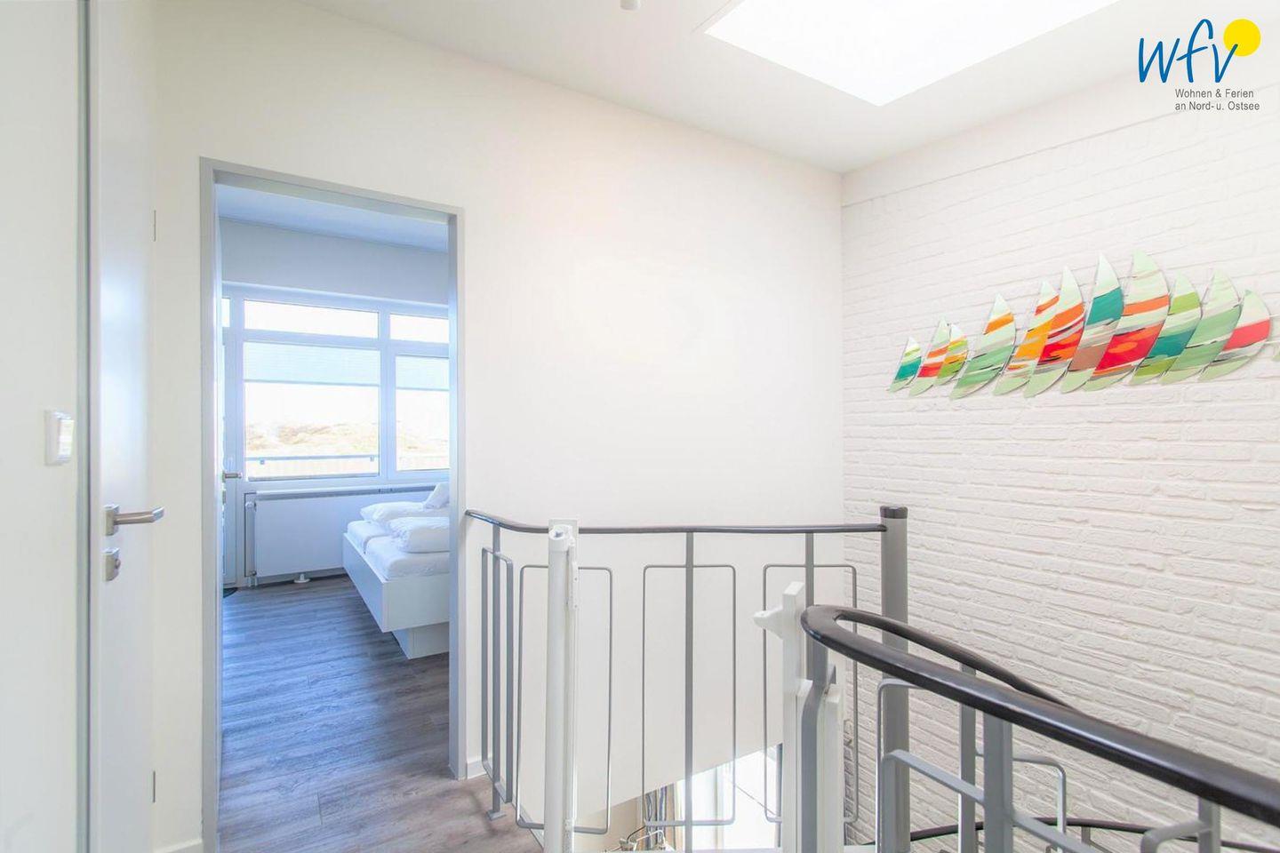 Eine Wendeltreppe führt zu den zwei separaten Schlafzimmern im Obergeschoss. Eines der Zimmer ist mit Doppelbett (180 x 200 cm) und kleiner Sitzecke ausgestattet. Dieser Raum besticht durch seine Panoramafensterfront mit einem traumhaften Blick in die Langeooger Dünenwelt. Genießen Sie vom angrenzenden möblierten Balkon die Luft und die Landschaft samt wunderschönen Sonnenaufgängen - sogar das Meer hören Sie hier rauschen! In dem anderen Schlafzimmer zur Gartenseite hin befindet sich neben dem Doppelbett (180 x 200 cm) ein Kinderbett für unsere kleinen Nordseeurlauber (120 x 70 cm). Die Schlafcouch im Wohnzimmer kann zu einem komfortablen kleinen Doppelbett umfunktioniert werden (160 x 200 cm).