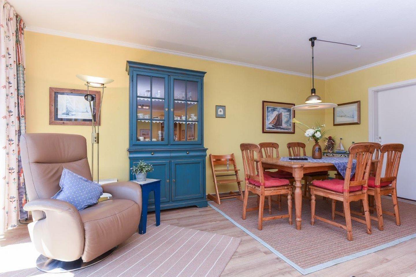 Reihenendhaus auf ca. 130m² für bis zu 8 Personen In ruhiger Lage am Ortsrand von Langeoog, großzügige Wohnbereich mit integriertem Essbereich, voll ausgestattete Küche mit weiteren Essplatz.