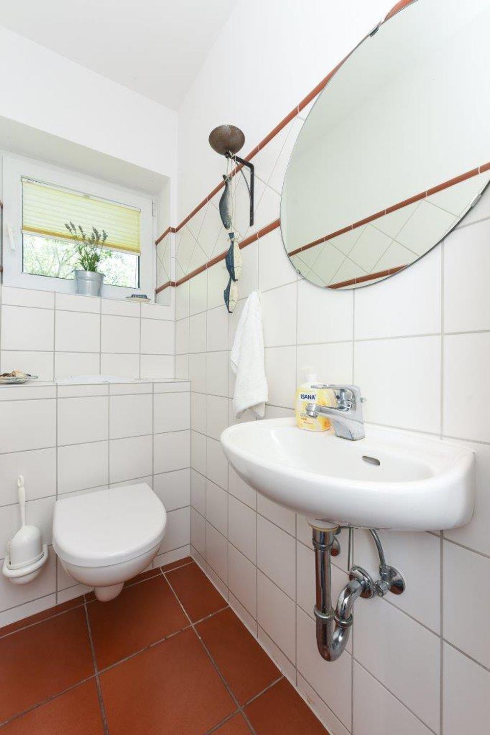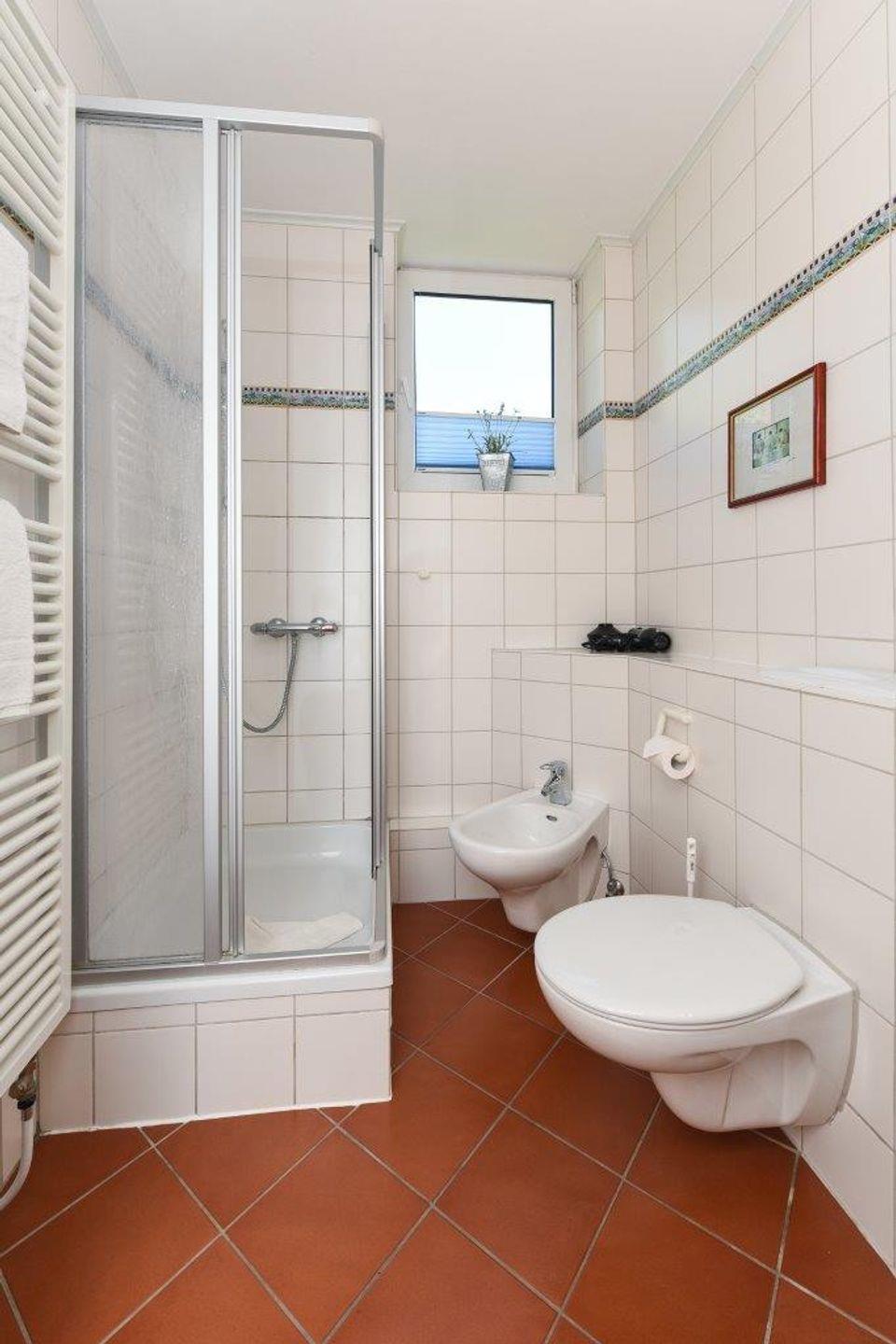 Die beiden hellen Badezimmer verfügen jeweils über eine Dusche und ausreichend Platz für entspannende Momente. Das Badezimmer im OG ist zusätzlich mit einem Bidet ausgestattet. Im EG gibt es zusätzlich ein Gäste-WC.