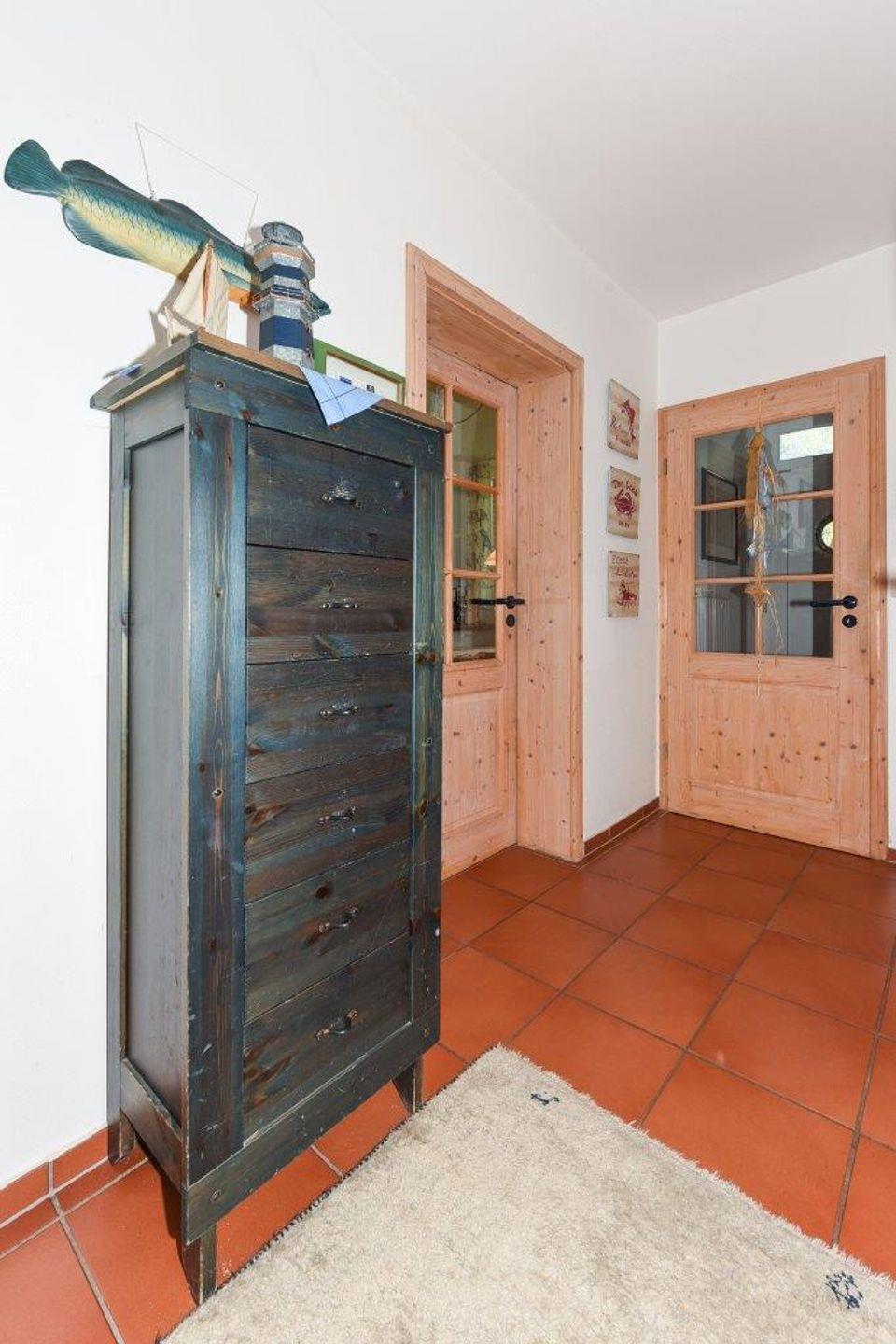 Die mit Massivholzmöbel im maritimen Landhausstil liebevoll gestalteten Räume des Hauses überzeugen durch eine durchdachte Raumaufteilung. Der großzügige Wohnbereich ist mit Schiffsbodenlaminat ausgestattet und die bodentiefen Panoramafenster sorgen für eine luftige, lichtdurchflutete Atmosphäre. Im Wohnzimmer ist ein Essbereich integriert, welcher ausreichend Platz für gemeinsame Mahlzeiten bietet. Vom Wohnzimmer aus haben Sie direkten Zugang zur circa 25 m² großen Terrasse auf der Südseite des Hauses – perfekt für sonnige Stunden im Freien. Zusätzlich gelangen Sie hier zum circa 40 m²großen Garten sowie einer großen Spielwiese vor dem Haus.