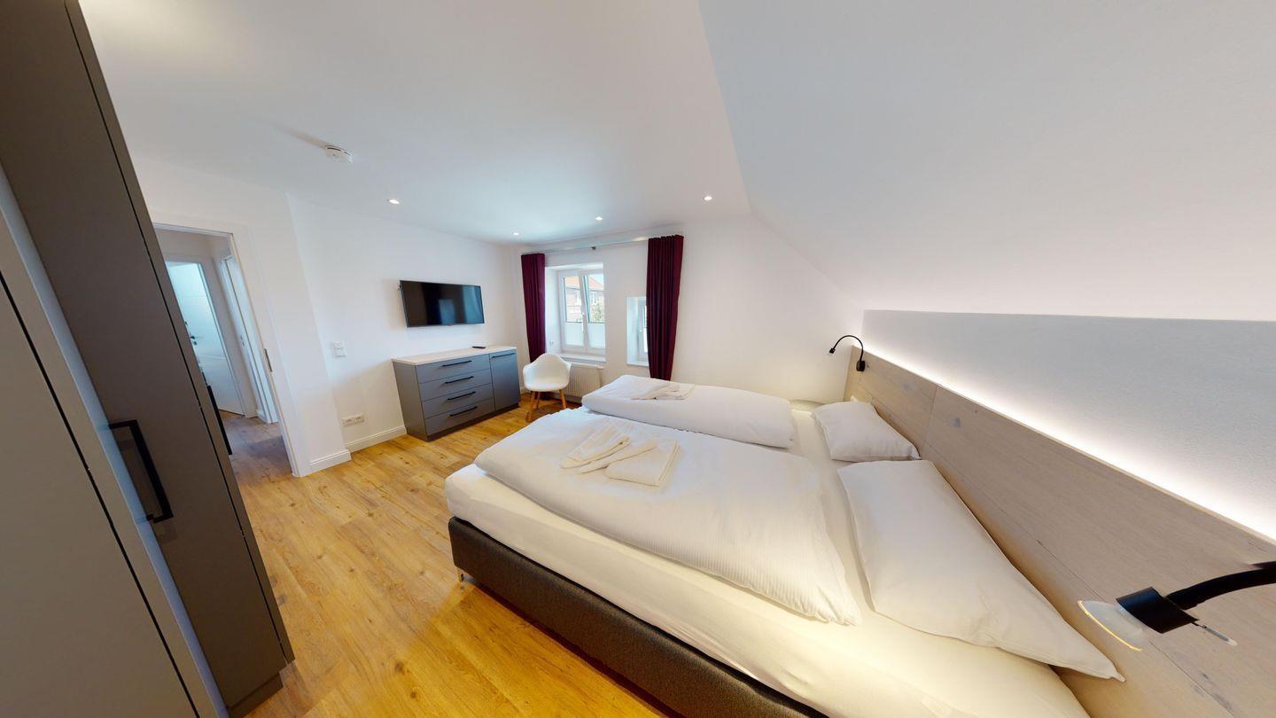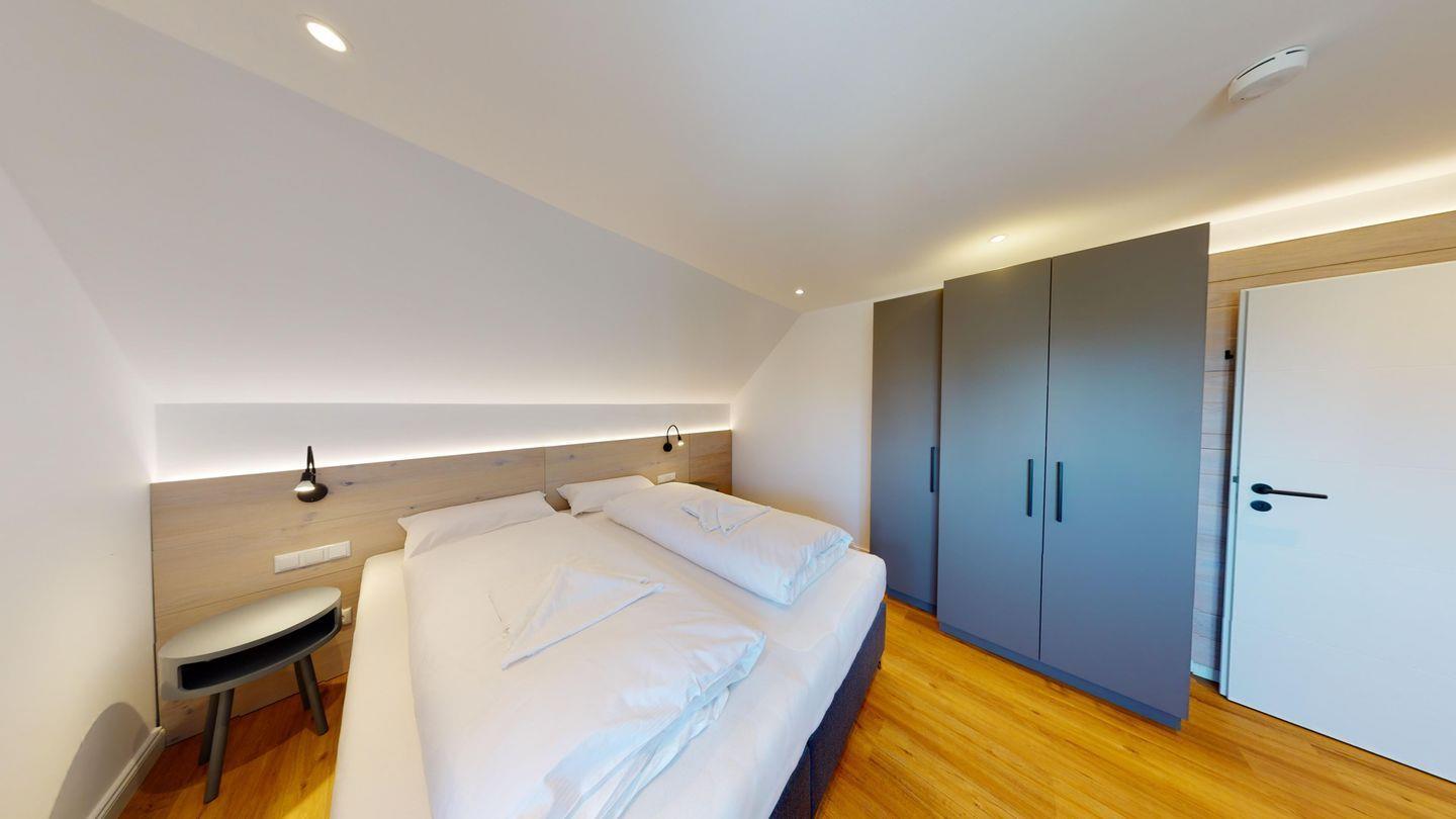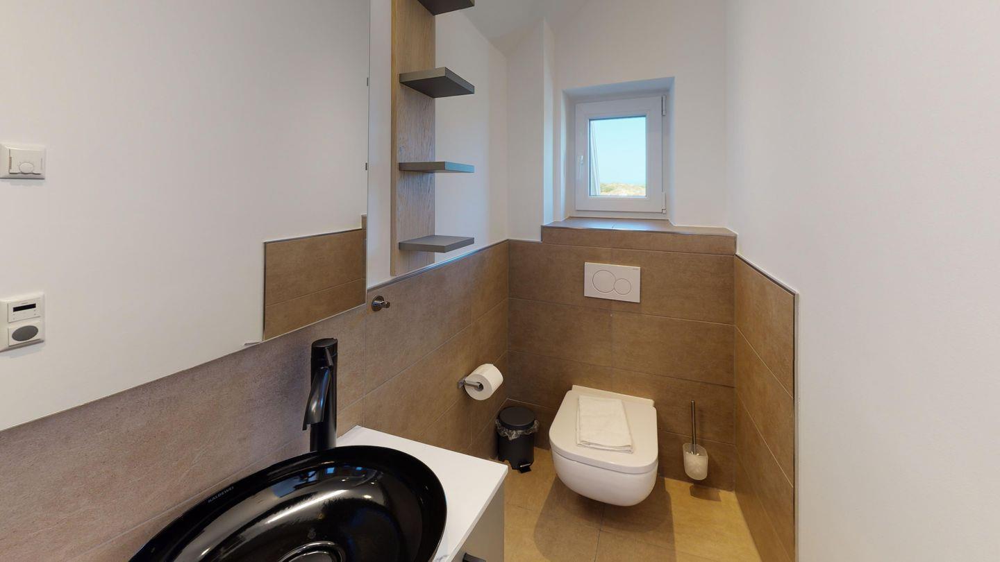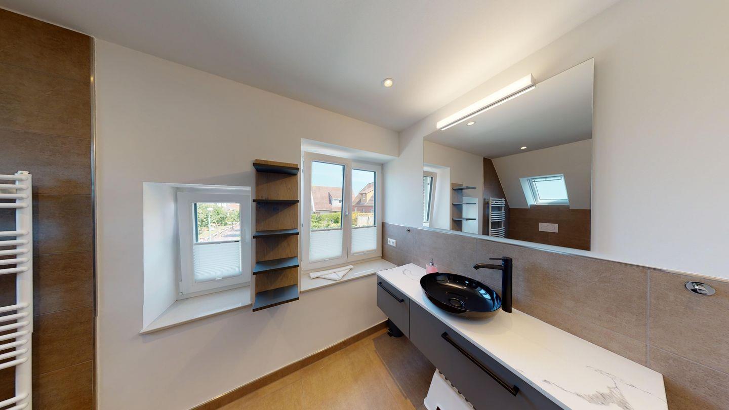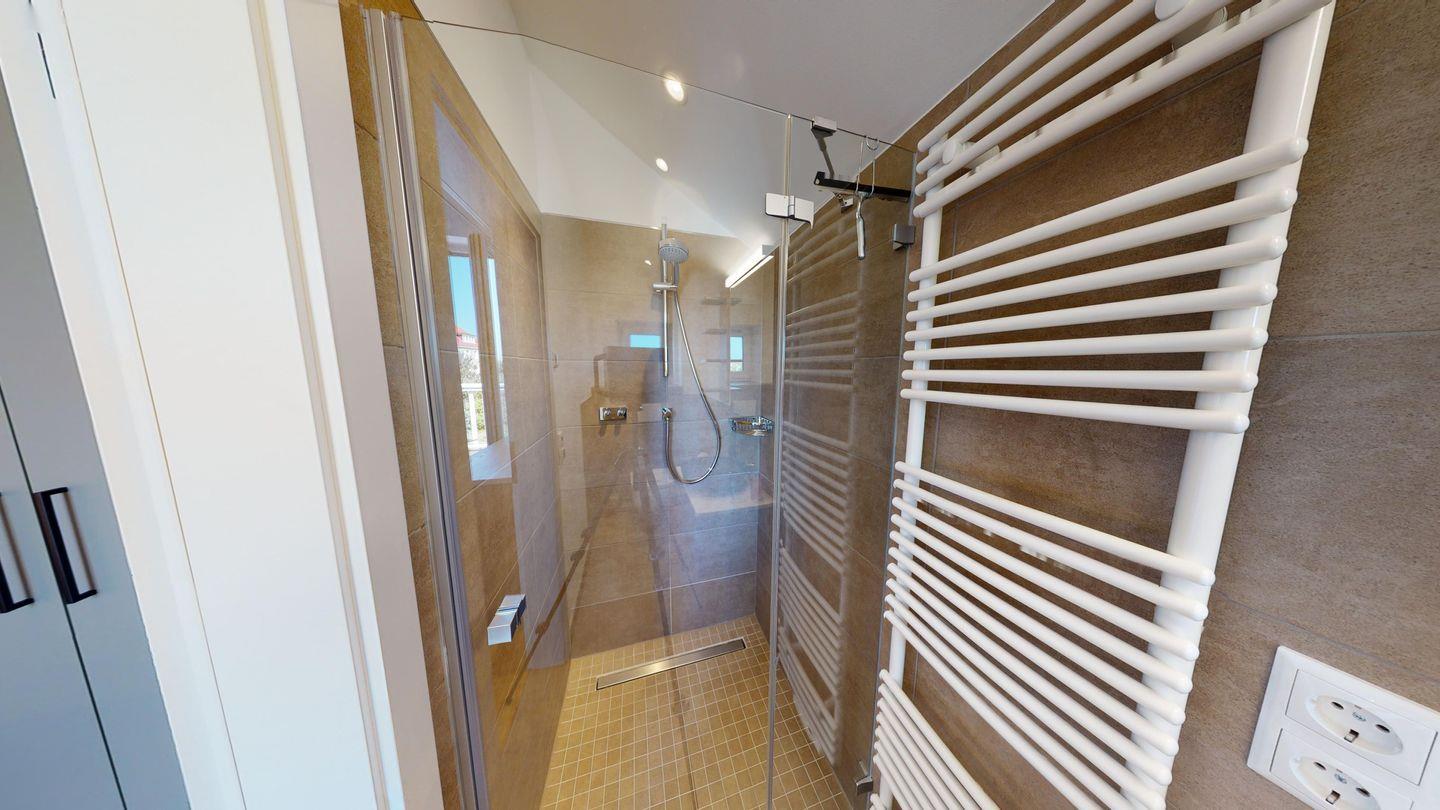 Zwei Schlafzimmer befinden sich im Obergeschoss und bieten jeweils ein modernes Tageslichtbad. Die Badezimmer sind wahre Wellnessoasen. Jedes Bad verfügt über einen Waschtisch mit viel Stauraum, eine Dusche und ein WC. Über das Hauptschlafzimmer gelangen Sie auf einen großzügigen Balkon, auf dem Sie z.B. Ihren Morgenkaffee genießen können.