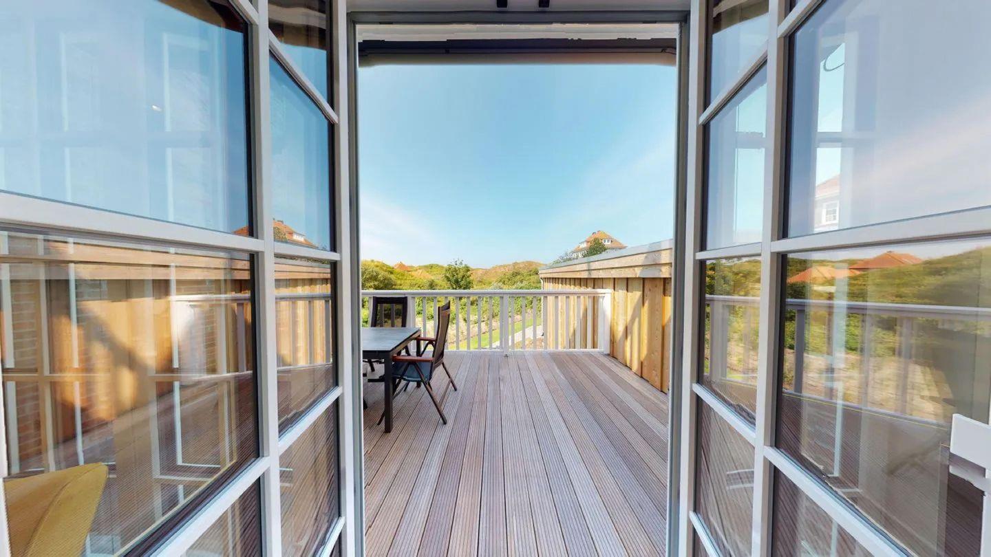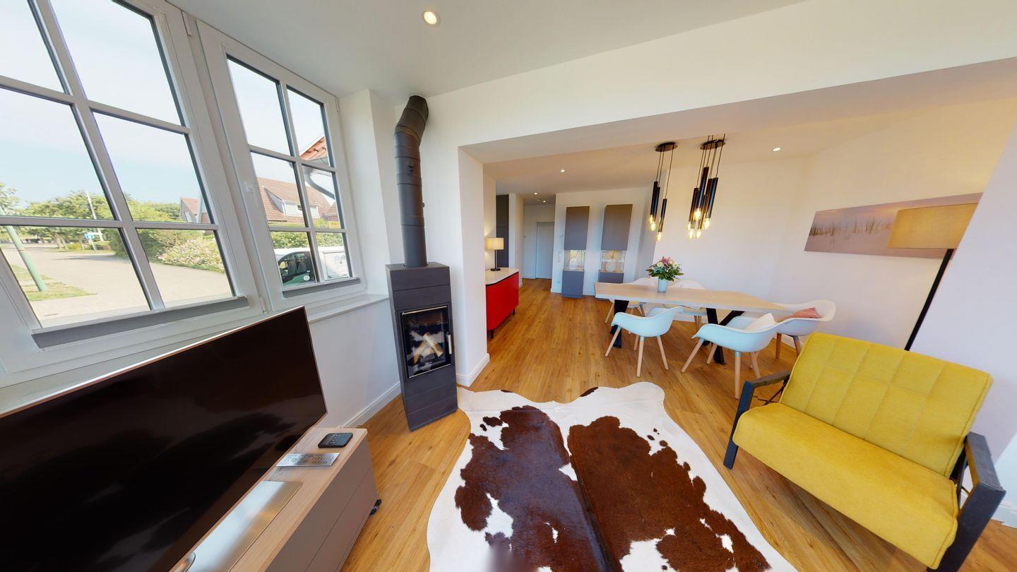 EG: Wohnbereich mit bodentiefen Sprossenfenstern und Dünenblick, Kaminofen, offene Küche, großer Essplatz, Gäste-WC, Abstellraum, Hochparterre-Terrasse mit Sitzmöbeln und Markise
