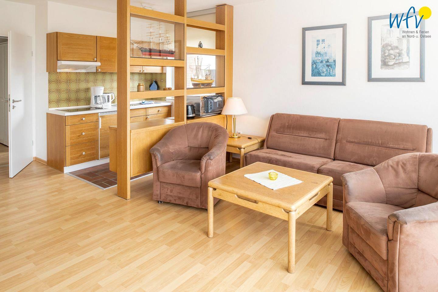 In dem hellen Wohnraum empfängt Sie eine sehr freundliche Atmosphäre. Große Fenster sorgen für viel Tageslicht, bequeme Möbel für Gemütlichkeit und maritime Accessoires für das entsprechende Nordseeflair. Die Couchecke mit TV bietet nach dem Strandtag oder der Inselwanderung Gelegenheit zum Fernsehen und Entspannen. Einige Gesellschaftsspiele sorgen für weitere Abwechslung. Zum Surfen vom Smartphone empfangen Sie freies WLAN; auch ein Telefon ist vorhanden.