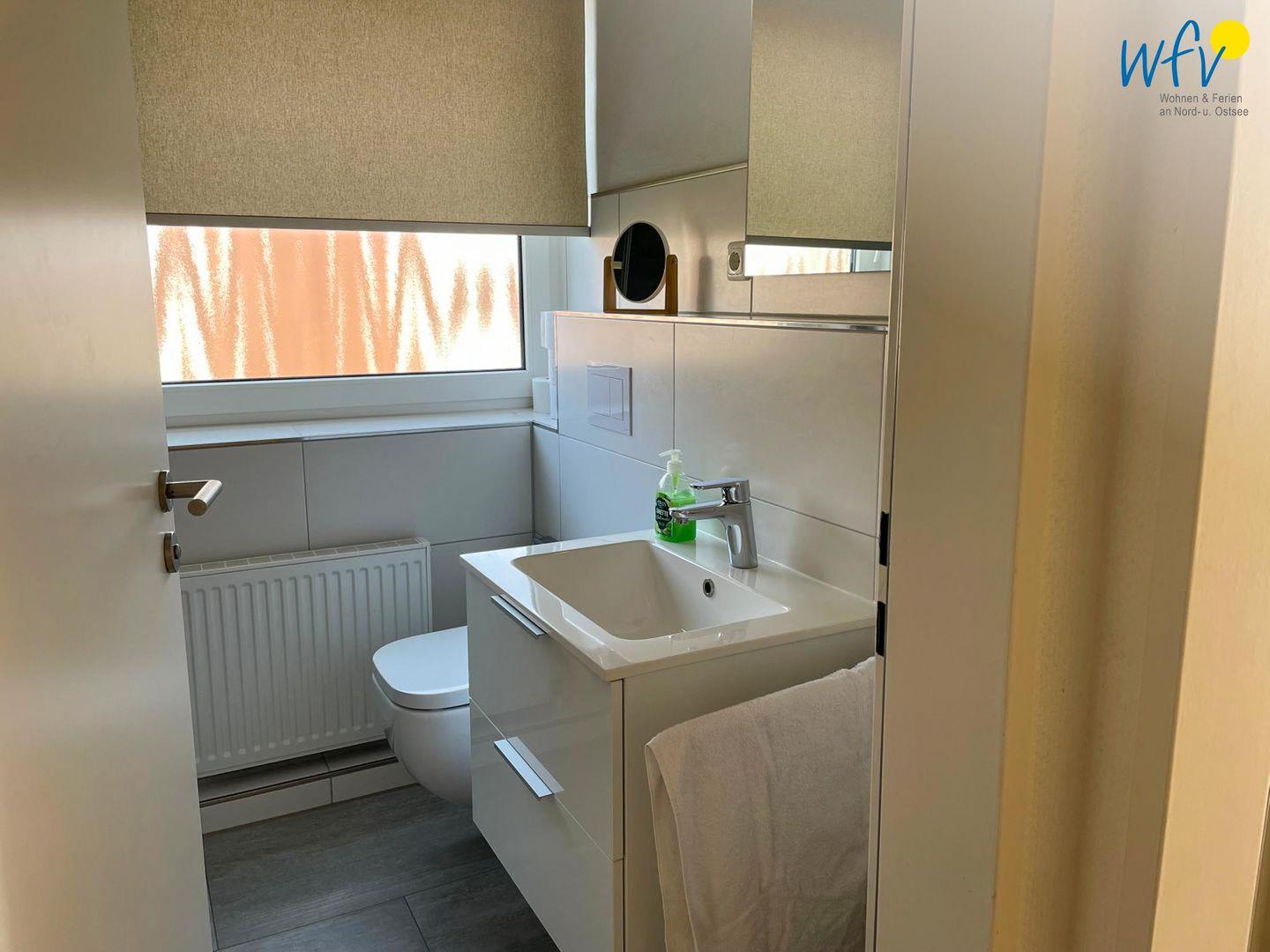 Das moderne Tageslichtbad mit bodengleicher Dusche, WC, Waschbecken mit Spiegel sowie Föhn und Kosmetikspiegel sorgt für weiteren Komfort.