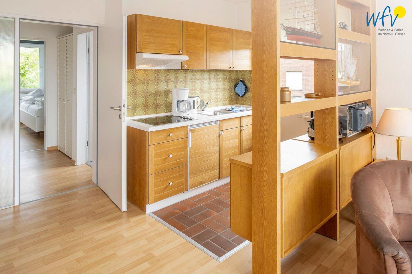 Für eine bequeme Selbstverpflegung steht Ihnen eine offene Küche zur Verfügung - u.a. mit Ceranherd, Mikrowelle und Kühlschrank mit Gefrierfach sowie diversen Kleingeräten. So lassen sich schnell und einfach Snacks für den Ausflug oder leckere Gerichte zubereiten. Ein Esstisch bietet Platz zum Klönen, für das Urlaubsfrühstück oder das gemeinsame Abendessen.