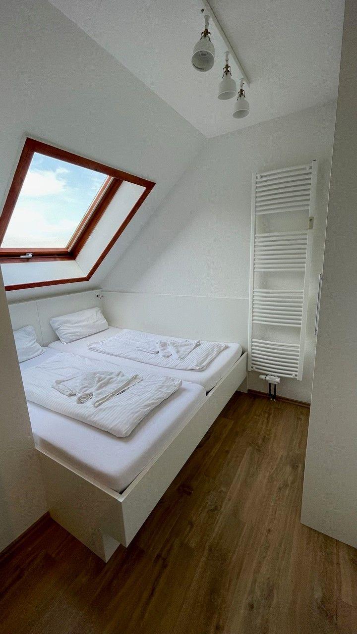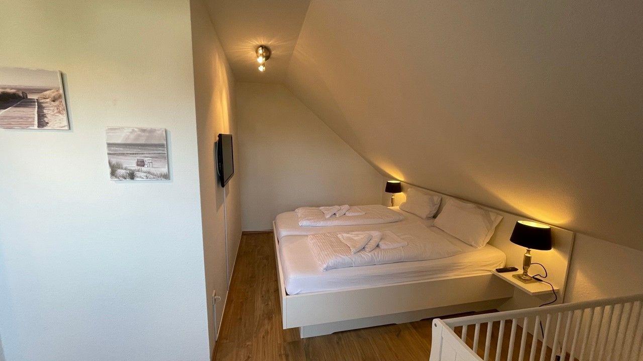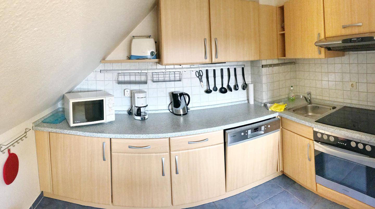 Der Erker trennt die offene Küche mit gemütlichem Essbereich von der Couchecke, die mit TV und Stereoanlage zum Verweilen einlädt.Die Ferienwohnung verfügt über 2 Schlafzimmer - das erste hat ein Doppelbett ( 180x200) und das zweite, als Kinderzimmer gedacht, hat eine gemütliche Schlafkoje (140x200).Das helle, freundliche Bad bietet Dusche, WC und Waschtisch.