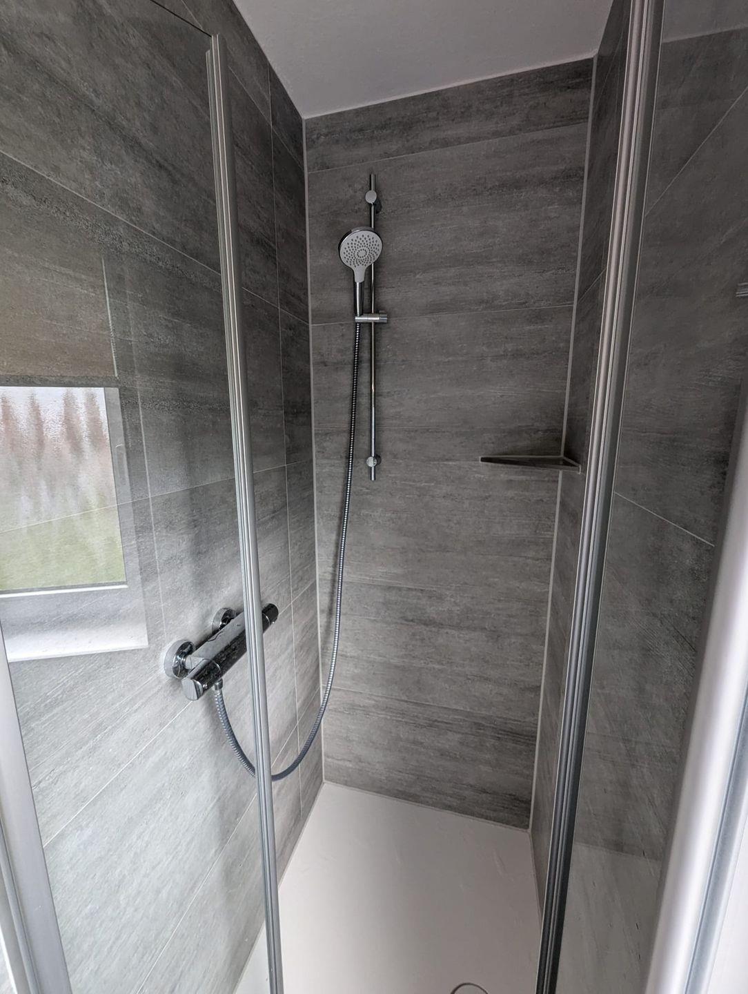 Das helle, moderne Bad verfügt über einen Waschtisch, ein WC und eine Dusche.