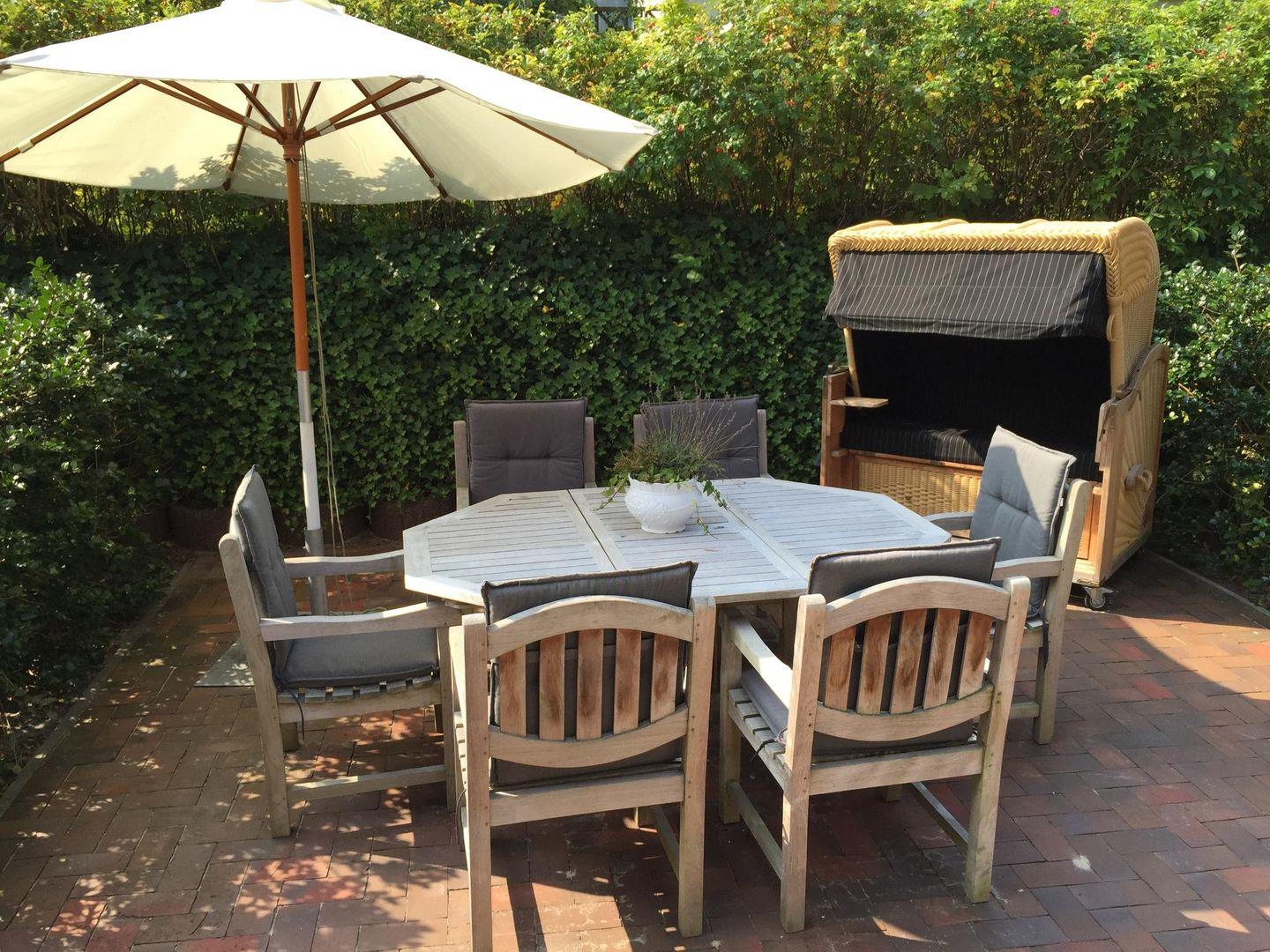 Im Sommer überzeugt das Reihenhaus mit seiner ruhigen, aber zentrumsnahen Lage am Westrand des Dorfkerns, seinem schönen Balkon und der vollmöblierten Terrasse mit Strandkorb.