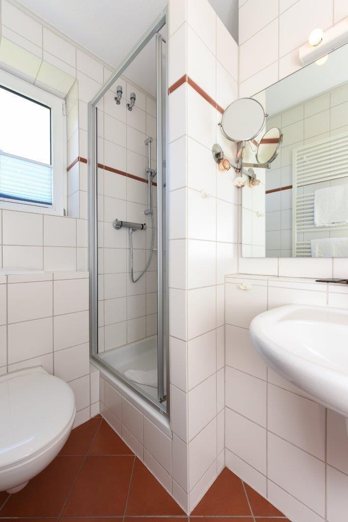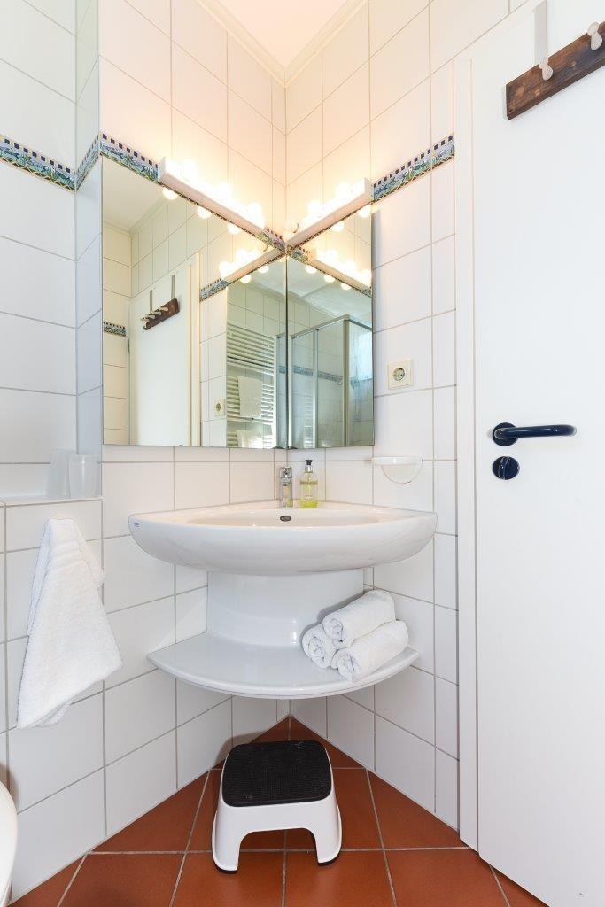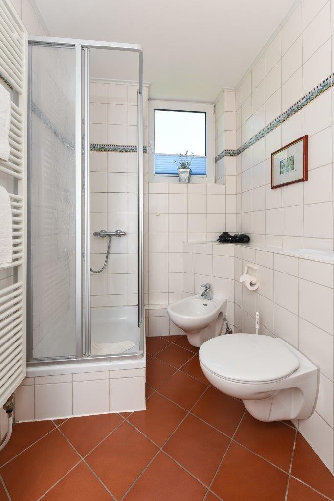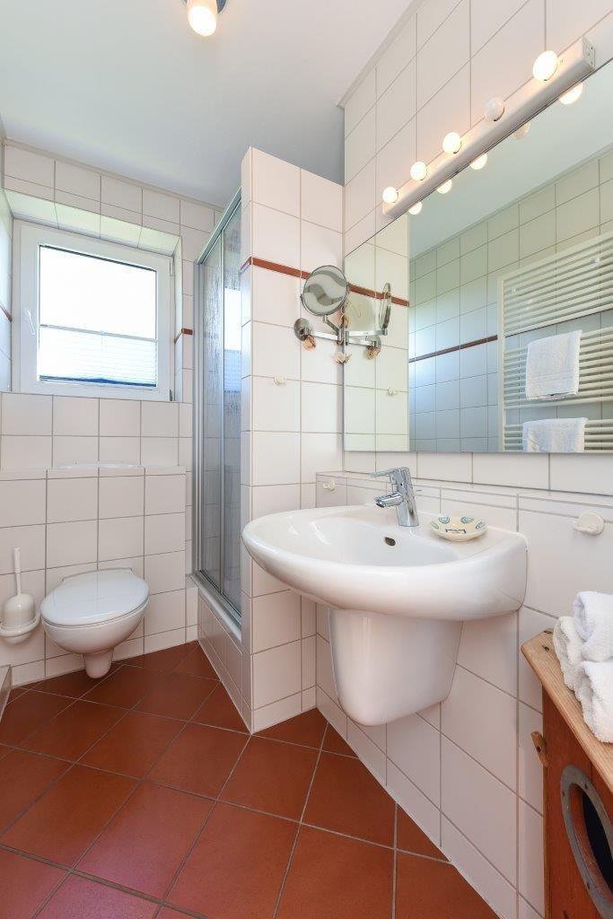 verfügen jeweils über eine Dusche, einen Waschtisch und ein WC. Das Bad im Obergeschoss hat zusätzlich ein Bidet. Das gemütliche Ferienhaus,