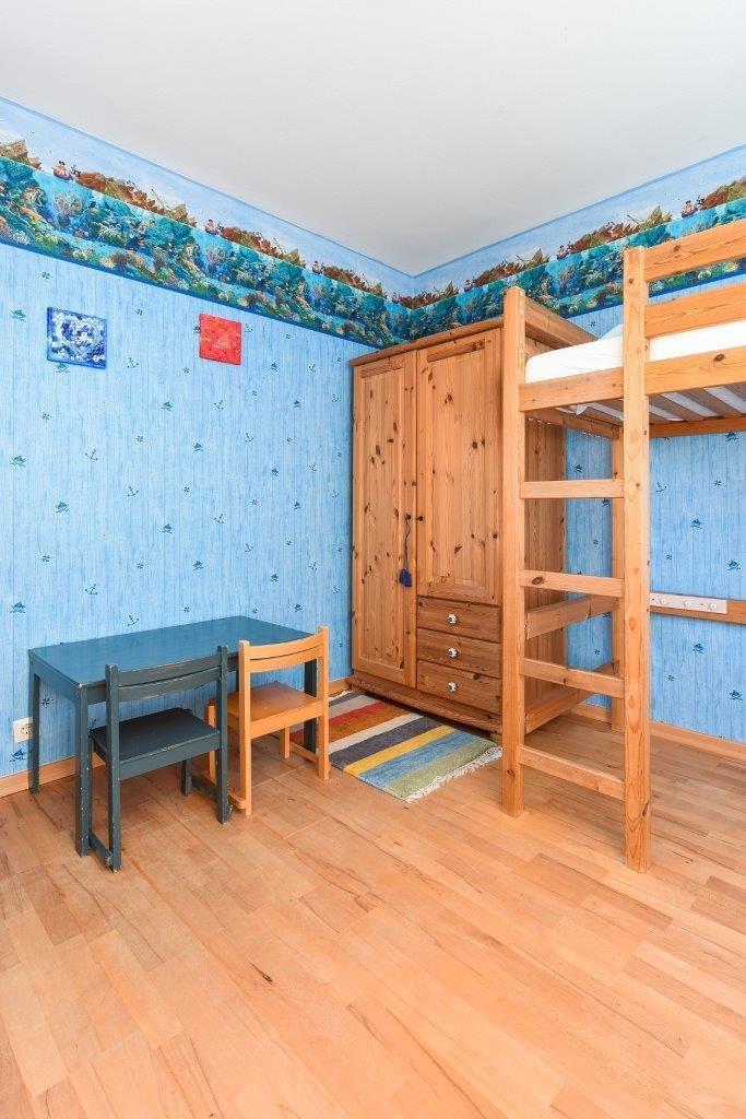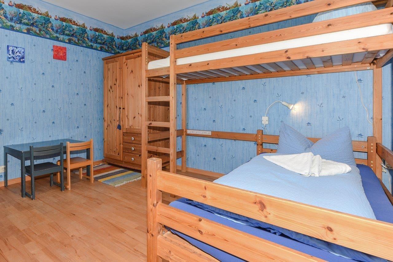 Schlafzimmer mit jeweils großen Doppelbetten (200x200 cm). Im Kinderzimmer gibt es ein Etagenbett und ein Kinderbettchen. Die beiden hellen Badezimmer