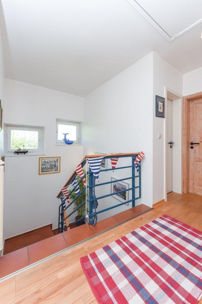 Zusätzlich haben Sie Zugang zum circa 40 Quadratmeter großen Garten sowie einer großen Spielwiese vor dem Haus. Im Obergeschoss finden Sie zwei