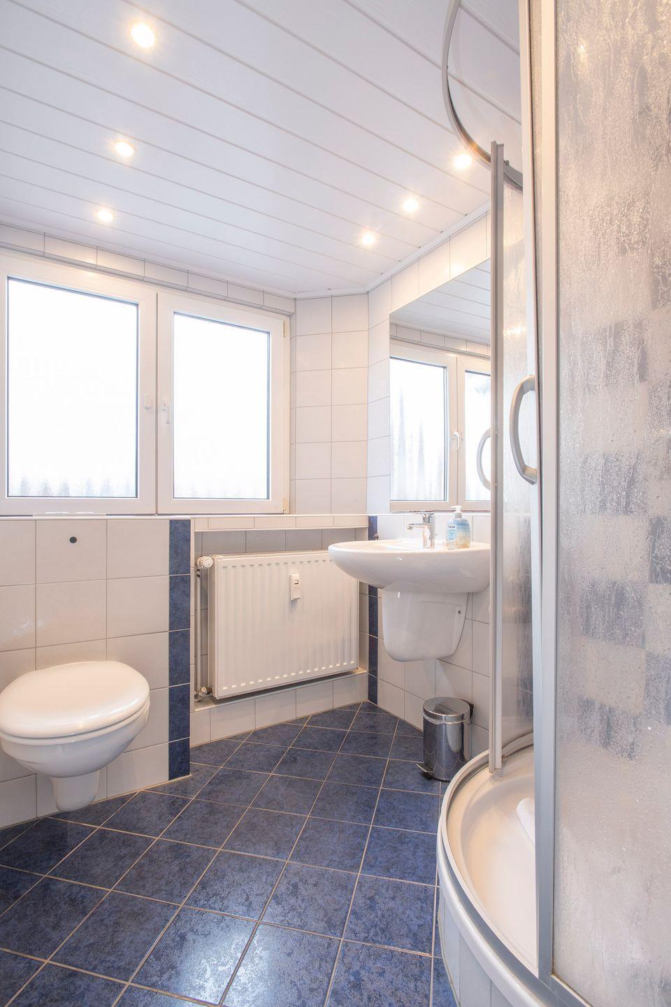 Das moderne, tageslichtdurchflutete Bad mit Waschtisch, Dusche sowie WC lässt keine Wünsche offen.