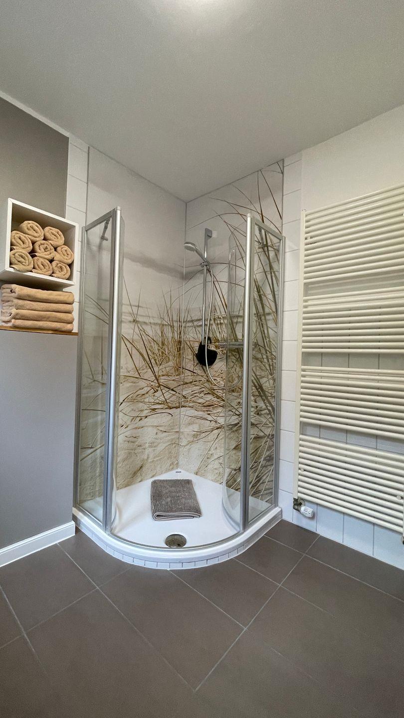 Das Bad ist mit einer Dusche sowie Waschtisch und WC ausgestattet. Der Wäschebereich mit Waschmaschine und Trockner befindet sich im Gemeinschaftskeller und ist kostenpflichtig.