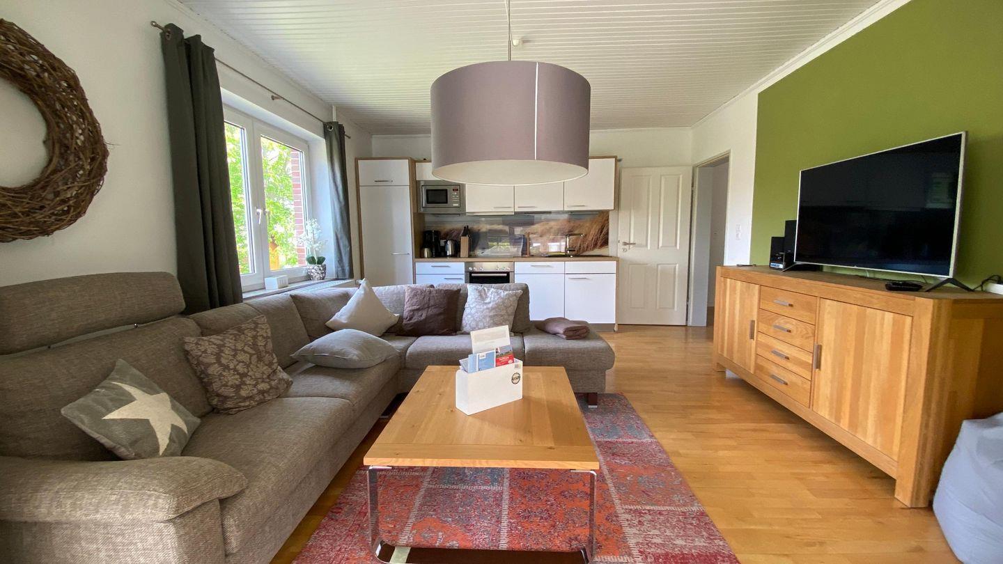 Der Wohnbereich verfügt über eine komplett ausgestattete Küche mit angrenzendem gemütlichen Couchbereich der in den lichtdurchfluteten Wintergarten führt. Dort befindet sich der großzügige Essbereich mit direktem Zugang zur angrenzenden Terrasse und Übergang zum Garten.