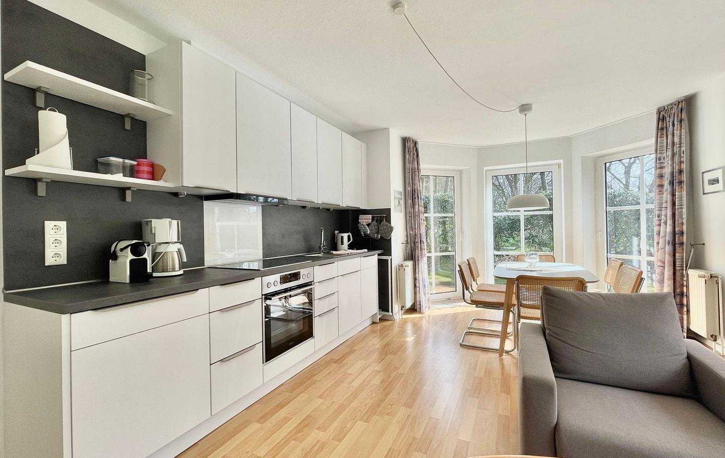 Die lichtdurchflutete Ferienwohnung misst 48 Quadratmeter und verfügt über einen geräumigen Wohn- und Essbereich mit offener Küche - außerdem befindet sich hier auch die herrliche Sitzgruppe, auf der Sie vollkommen entspannen können. Das schöne Schlafzimmer ist einem Doppelbett ausgestattet, die zum Träumen einladen - weitere Schlafplätze finden Sie auf der Schlafcouch im Wohnzimmer.
