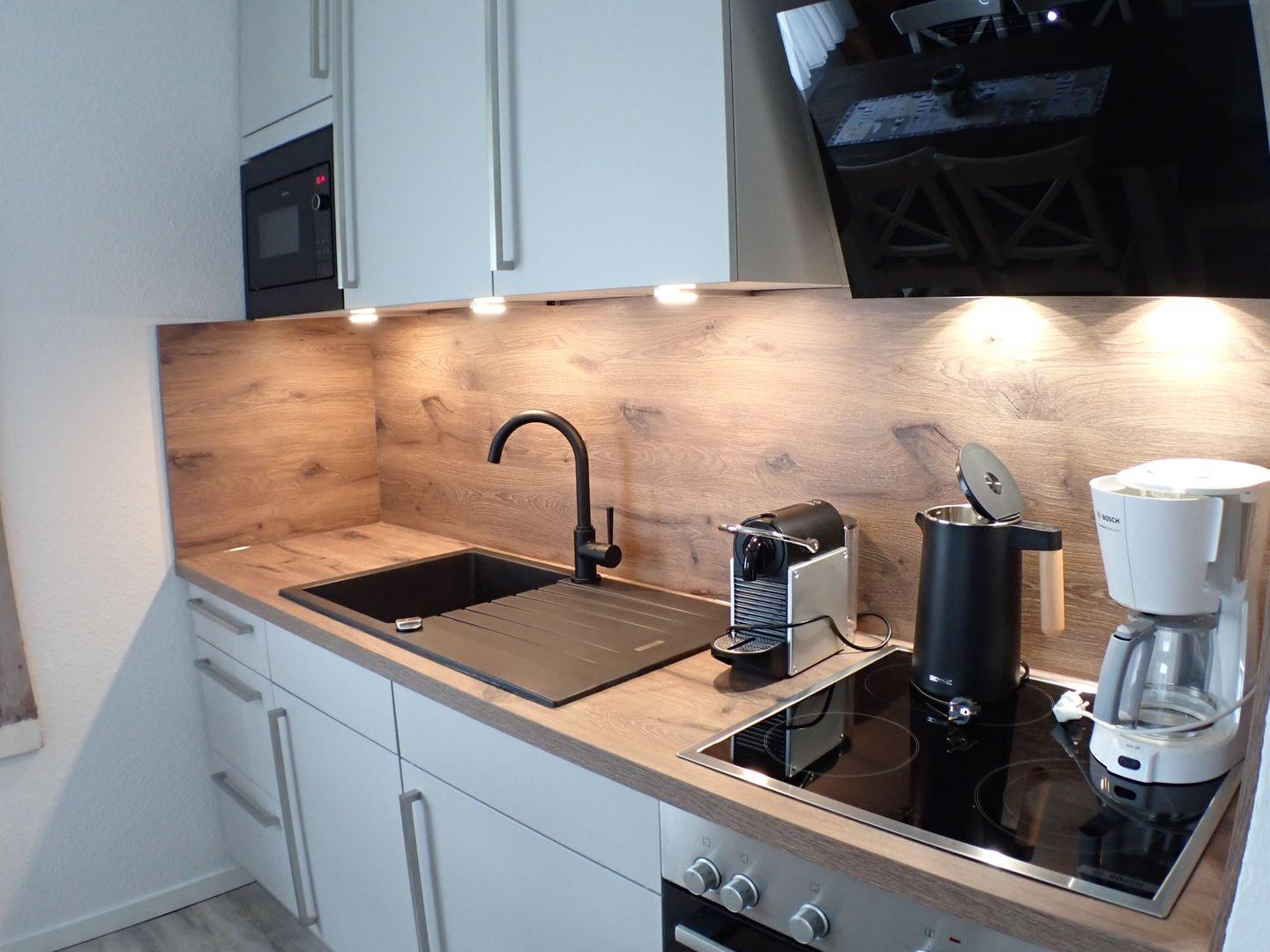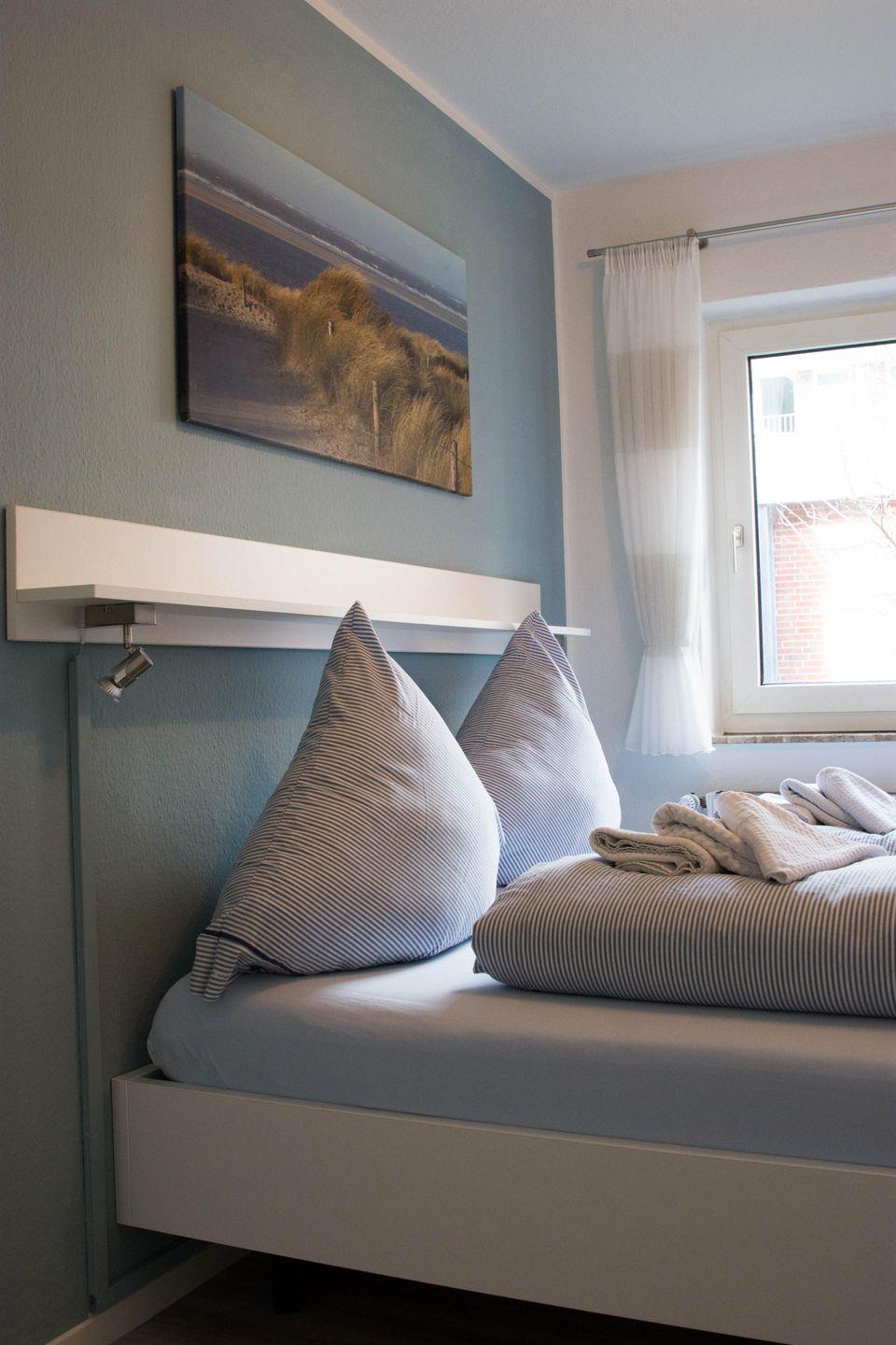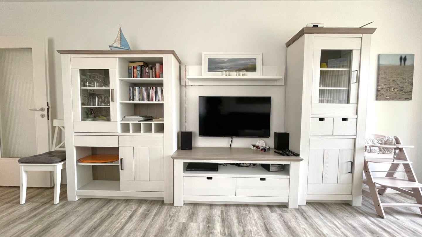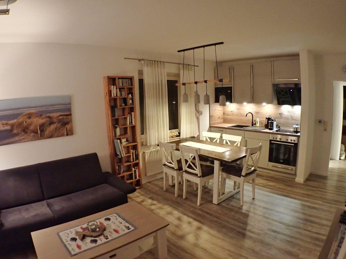 Das Wohnzimmer verfügt über eine Schlafcouch und kann vollständig abgedunkelt werden, sodass insgesamt bis zu sechs Personen in dieser FeWo auf Langeoog übernachten können. In der gut ausgestatteten Küche finden Sie einen vierflammigen Herd mit Ceranfeld und Backofen sowie einen Tischgrill, ein Raclettegerät, eine Mikrowelle, einen Wasserkocher und eine Kaffeemaschine. Die Ausstattung umfasst des Weiteren ein Babybett und einen Hochstuhl für Ihre Kleinsten, kostenloses WLAN und Telefonieren ins deutsche Festnetz, einen Flachbildfernseher sowie einen Blu-ray-Player. Urlaubslektüren, Kinderspielzeug und Gesellschaftsspiele ergänzen unser Angebot. Bei Bedarf können Sie die Waschmaschine und den Trockner ( kostenpflichtig ) im Speicher nutzen.