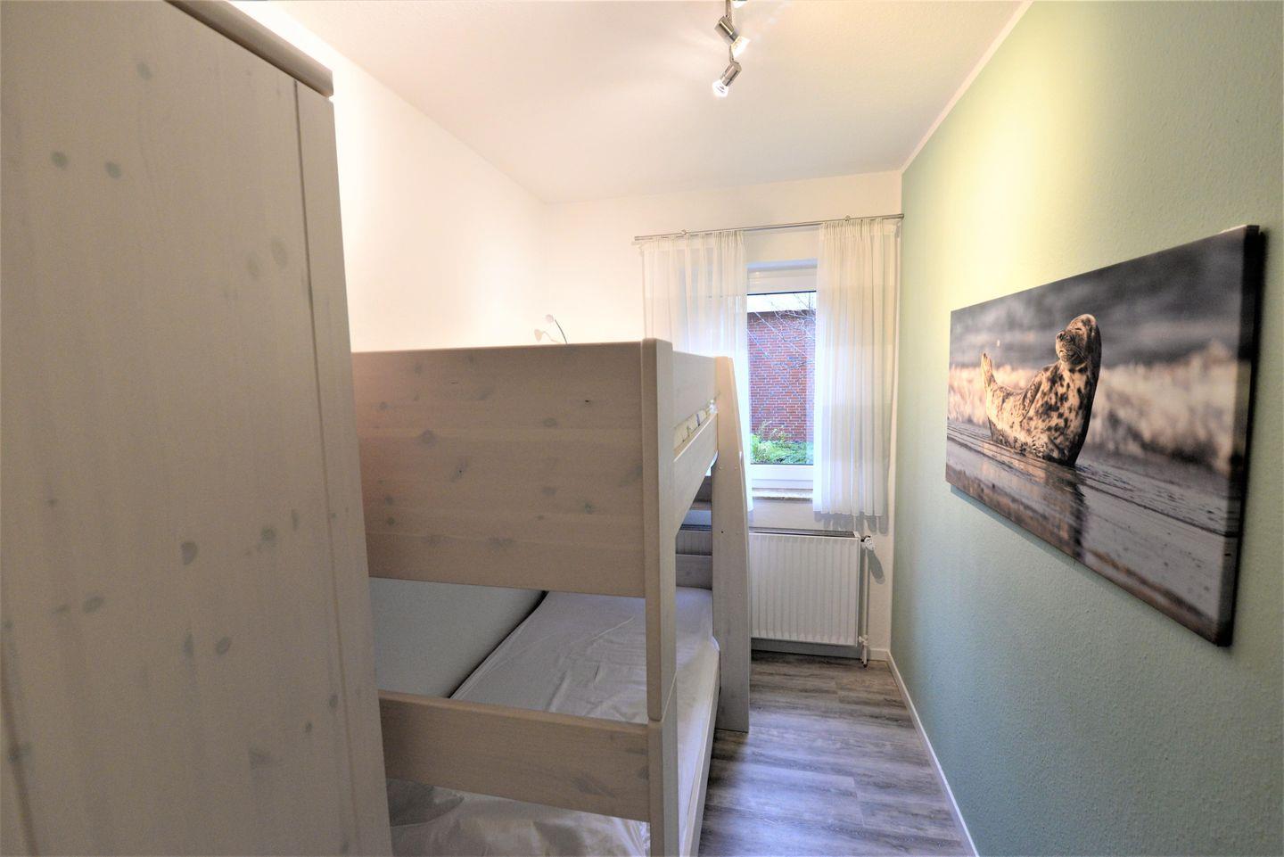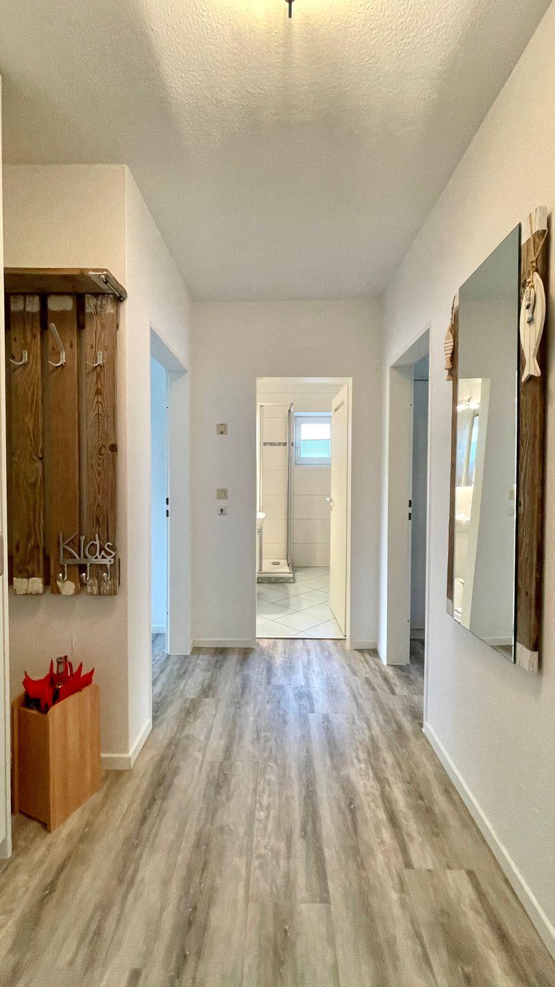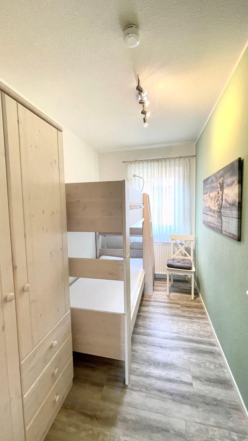 Die Ferienwohnung hat zwei Schlafzimmern mit Doppel- und Etagenbett, einem geräumigen Wohn-/ Küchenbereich, einem Badezimmer und einem Südbalkon.