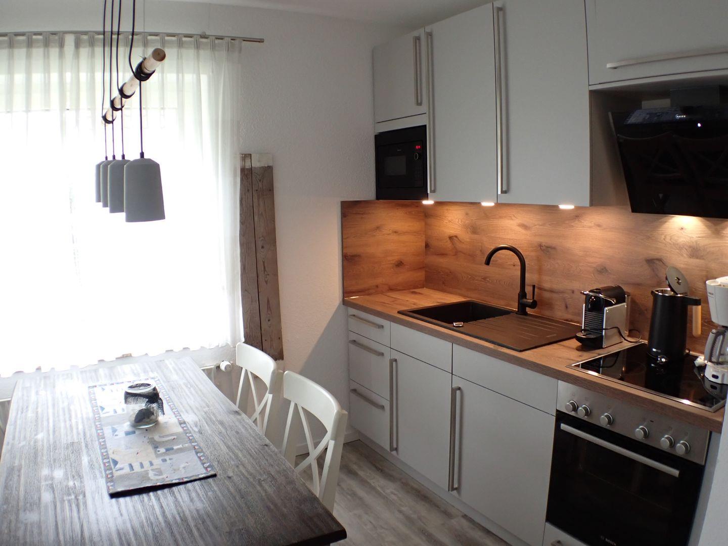 Das Wohnzimmer verfügt über eine Schlafcouch und kann vollständig abgedunkelt werden, sodass insgesamt bis zu sechs Personen in dieser FeWo auf Langeoog übernachten können. In der gut ausgestatteten Küche finden Sie einen vierflammigen Herd mit Ceranfeld und Backofen sowie einen Tischgrill, ein Raclettegerät, eine Mikrowelle, einen Wasserkocher und eine Kaffeemaschine. Die Ausstattung umfasst des Weiteren ein Babybett und einen Hochstuhl für Ihre Kleinsten, kostenloses WLAN und Telefonieren ins deutsche Festnetz, einen Flachbildfernseher sowie einen Blu-ray-Player. Urlaubslektüren, Kinderspielzeug und Gesellschaftsspiele ergänzen unser Angebot. Bei Bedarf können Sie die Waschmaschine und den Trockner im Speicher nutzen.