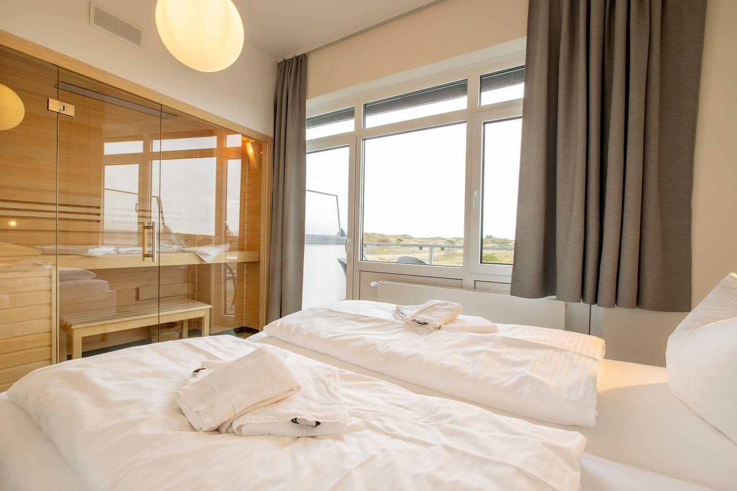 Weitere Highlights sind die finnische Sauna mit Dünenblick und 200cm Liegefläche, die Sie vom Schlafzimmer aus betreten mit einem phänomenalen Ausblick in die Dünenkämme vom Pirolatal.