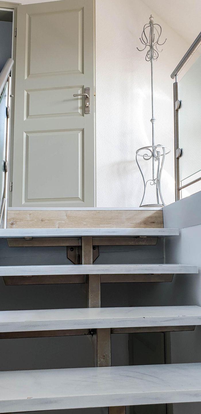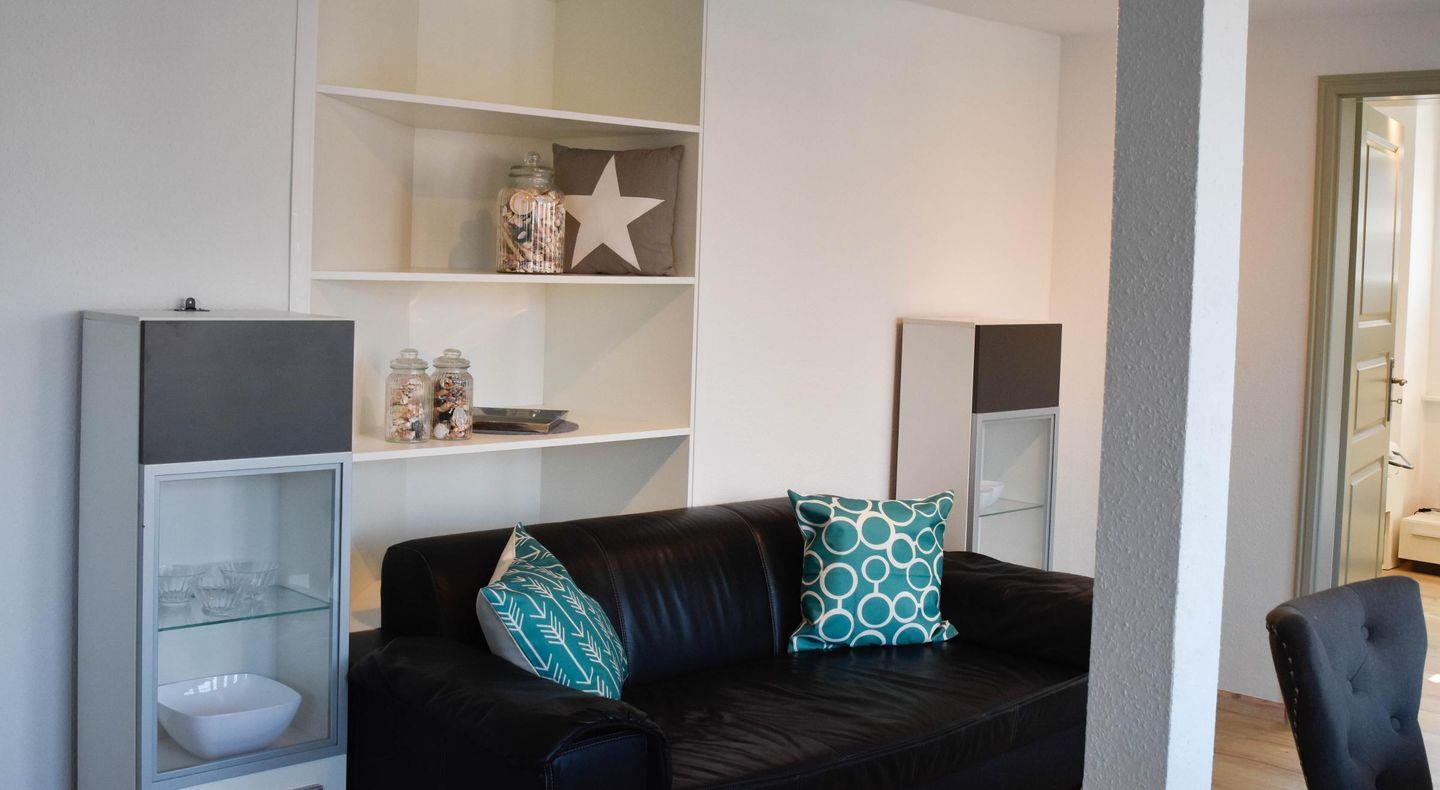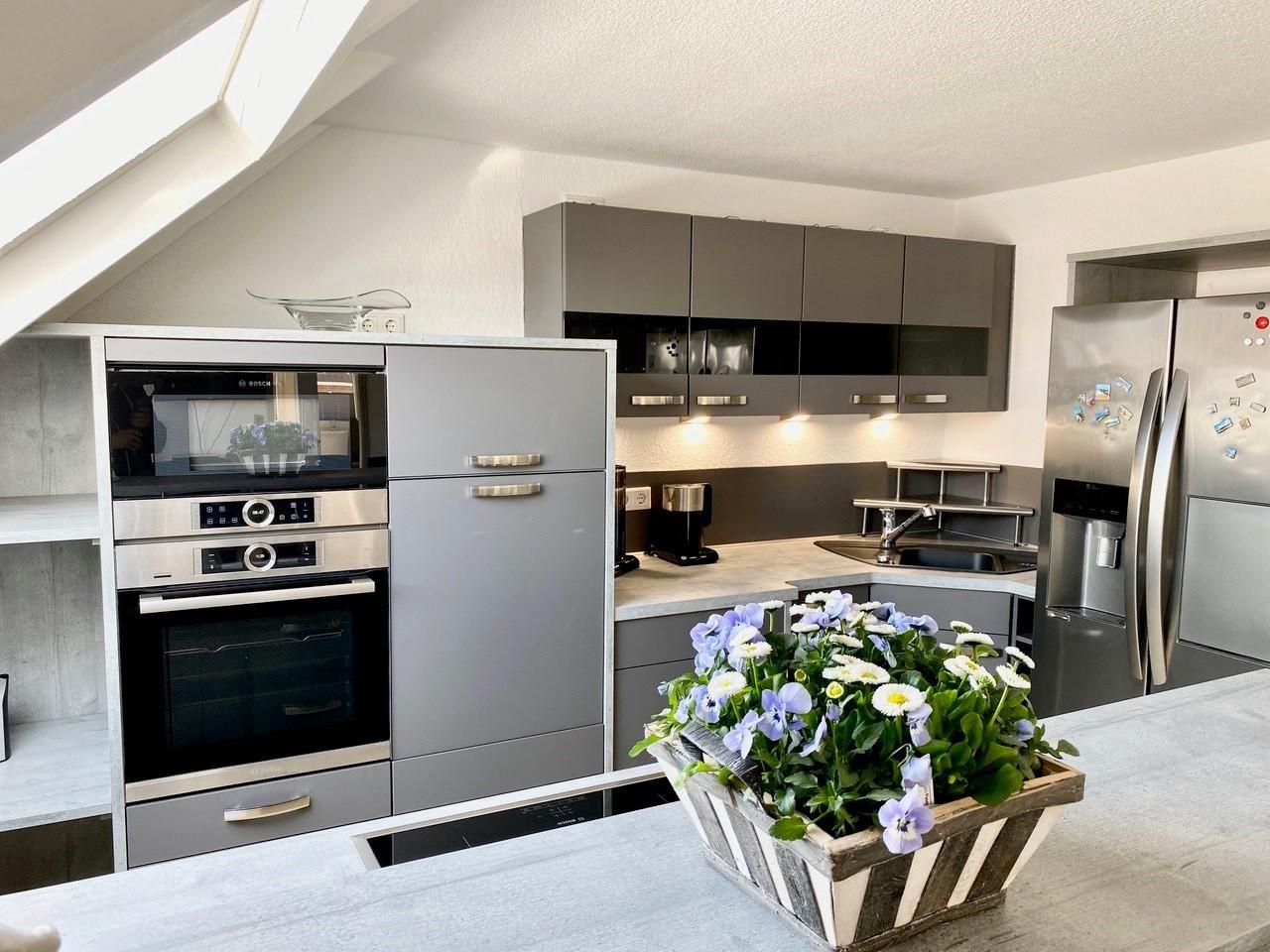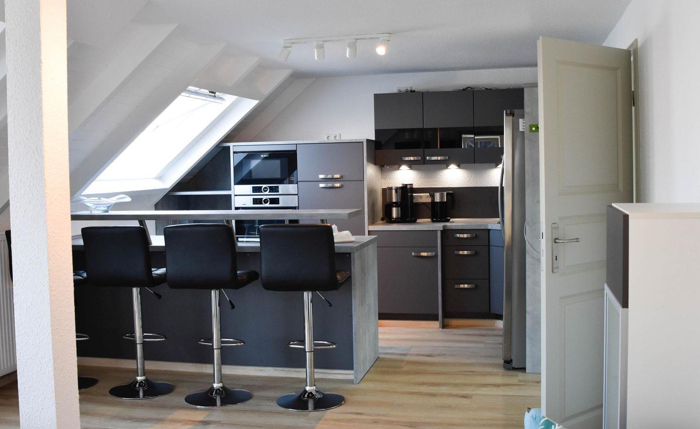 Im Eingangsbereich, bevor Sie über eine freistehende Treppe nach oben gelangen, befindet sich ein Gäste-WC im Eingangsbereich im Erdgeschoß. Der grosszügige Wohn- Essbereich bietet in einem Teil des Raumes eine begehbare offene Küche mit Frühstückstresen und amerkanischem Kühlschrank, die keine Wünsche offen lässt. Im anderen Teil erwartet Sie ein runder Esstisch zum Verweilen, die gemütliche Couchecke mit TV und der tolle Blick auf die schöne möblierte Dachterrasse. Das erste Schlafzimmer hat ein Doppelbett ( 180x200 ). Das zweite 2 Einzelbetten ( 140x200 und 90x200 ).