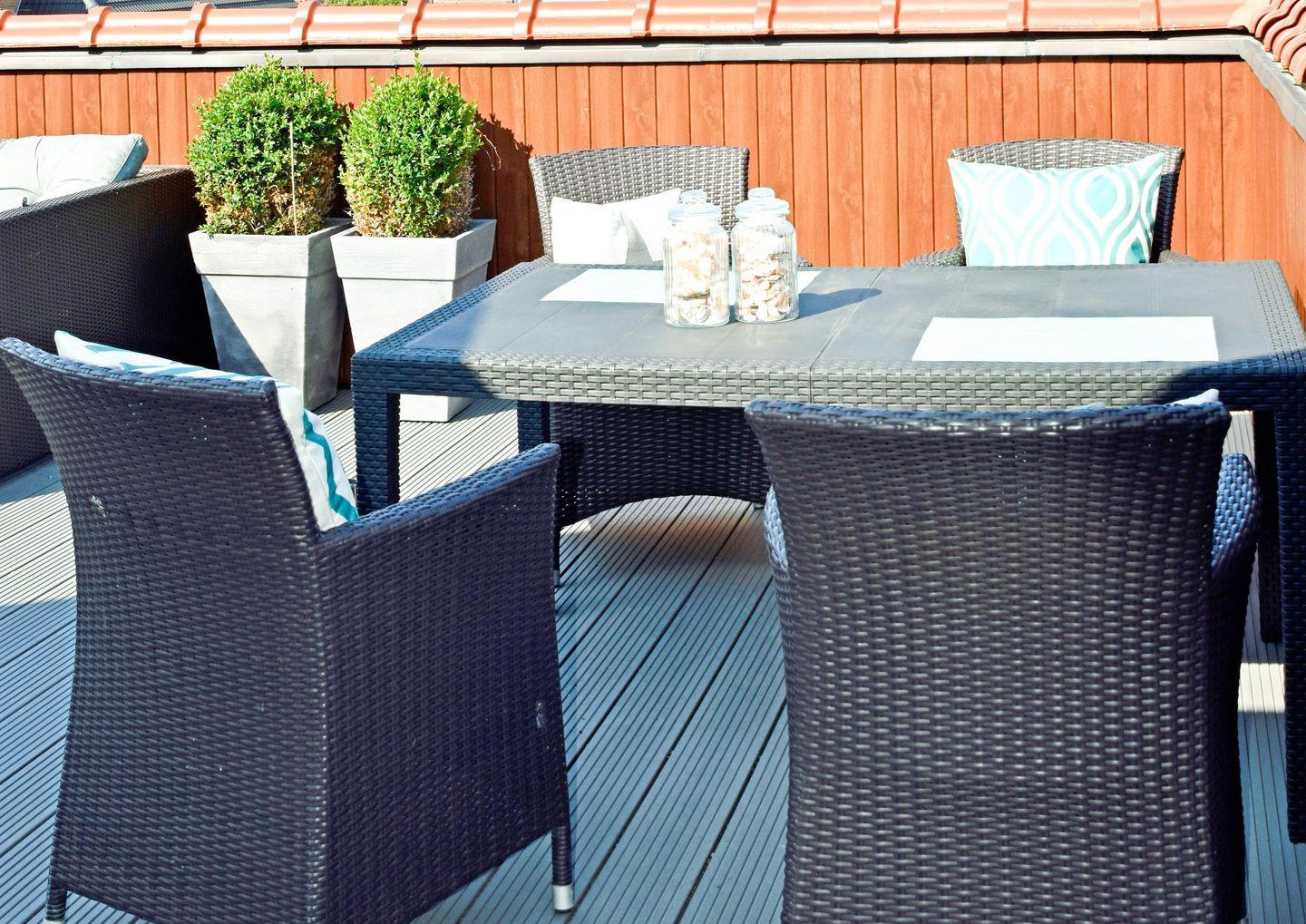 Die tolle Dachterrasse hat einen großen Esstisch sowie einen Sonnenschirm und eine Doppel-Relaxliege um die sonnigen Urlaubstage zu genießen.