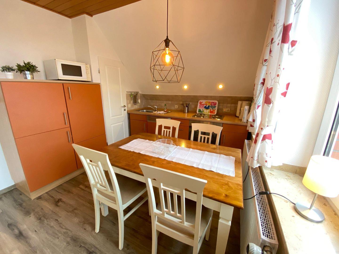 Im großen Wohn- / und Esszimmer mit angrenzendem Balkon befindet sich eine offene Küche mit Mikrowelle, Backofen und Spülmaschine.