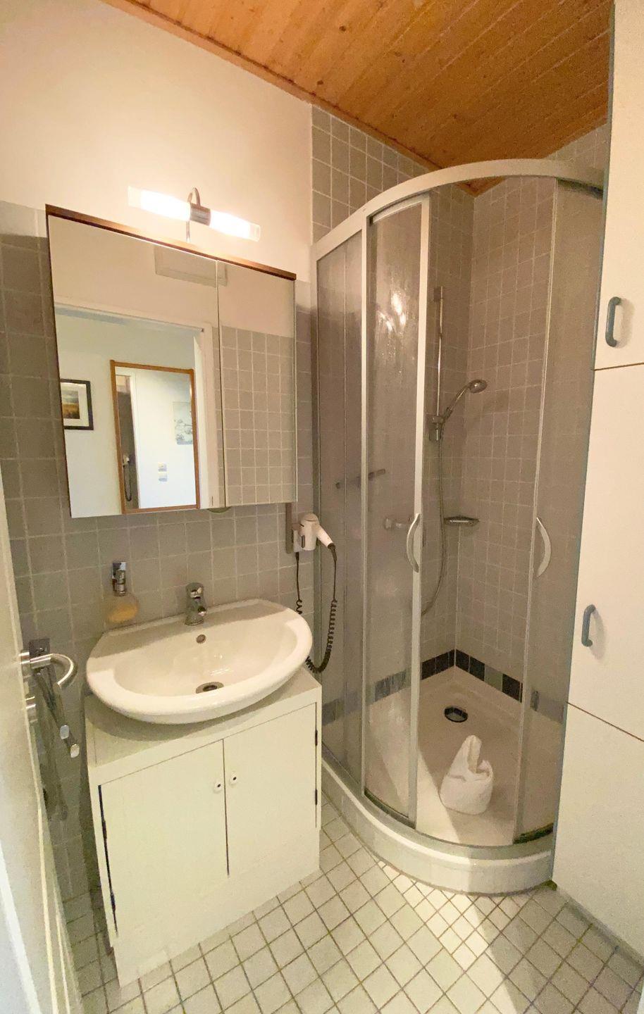 Das Bad mit Waschtisch und Dusche ist von der Toilette getrennt.