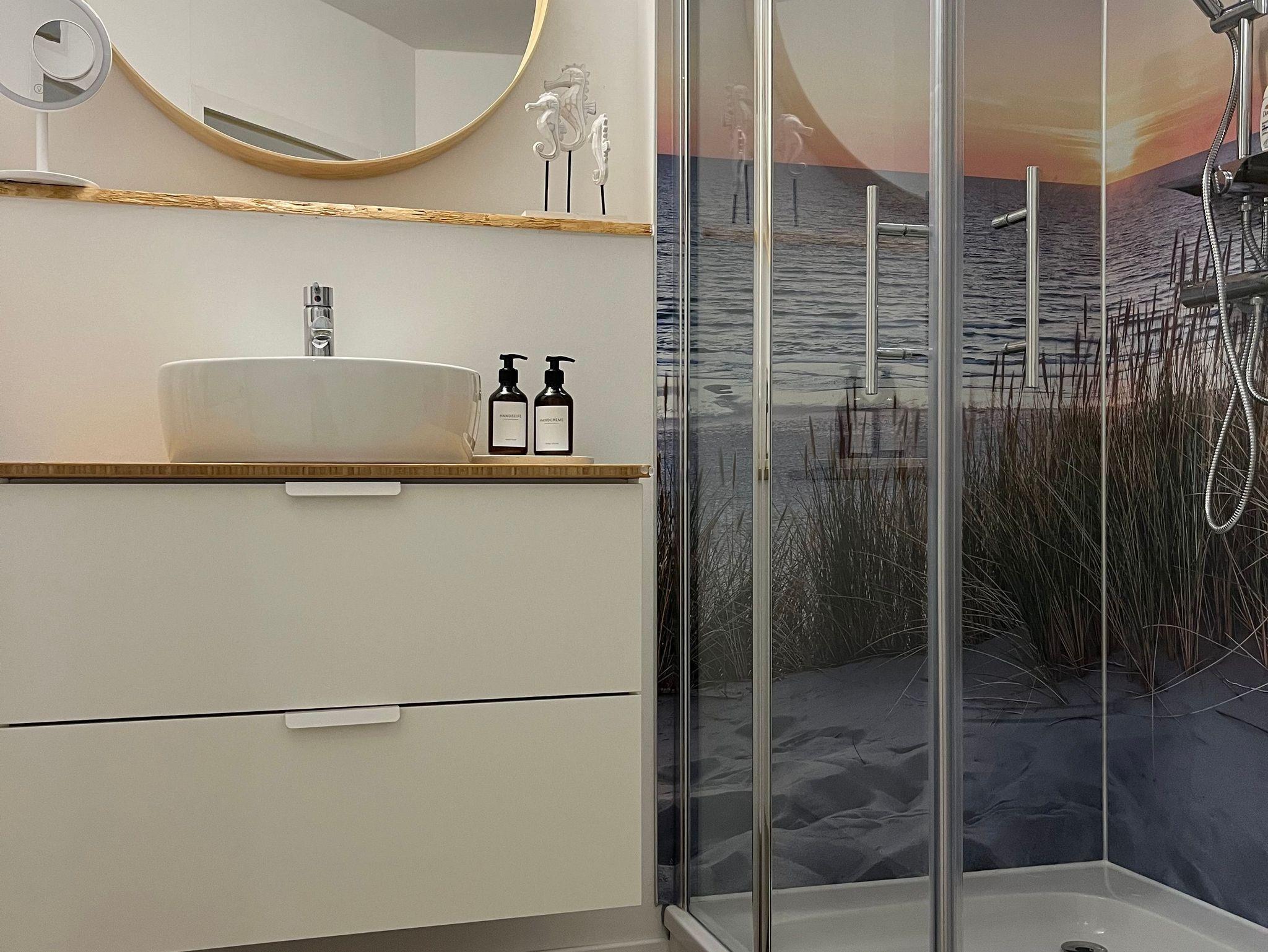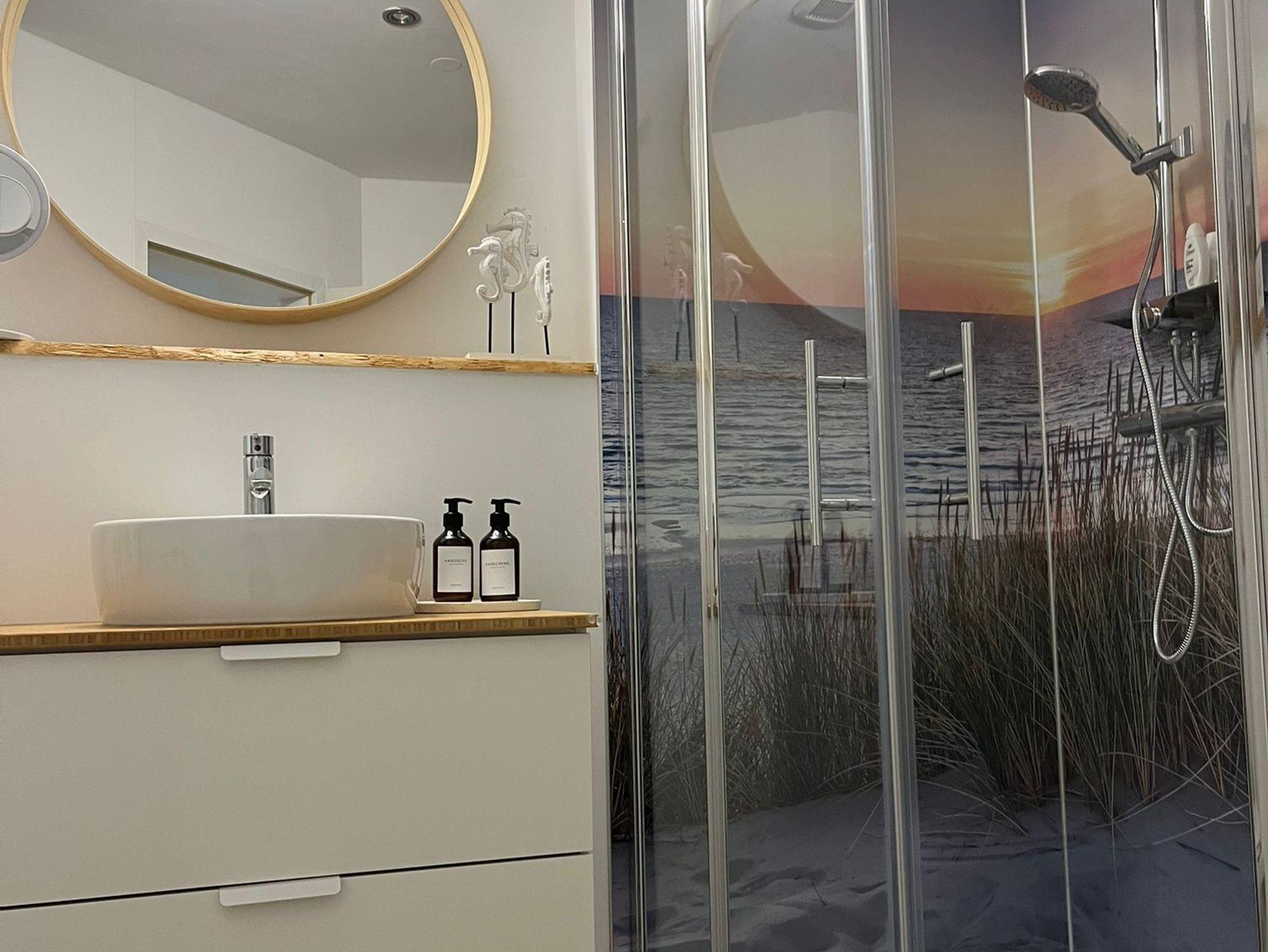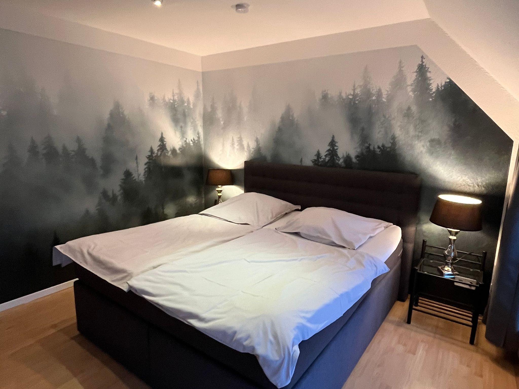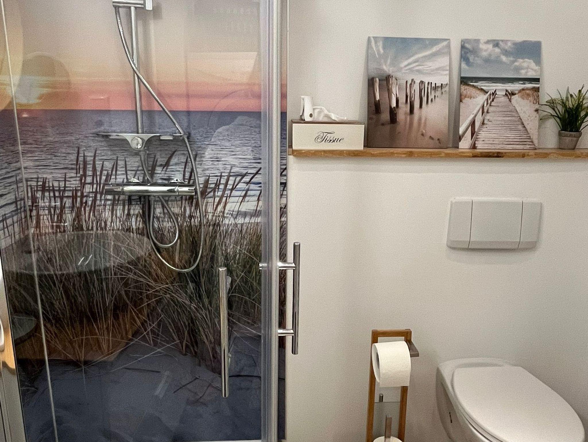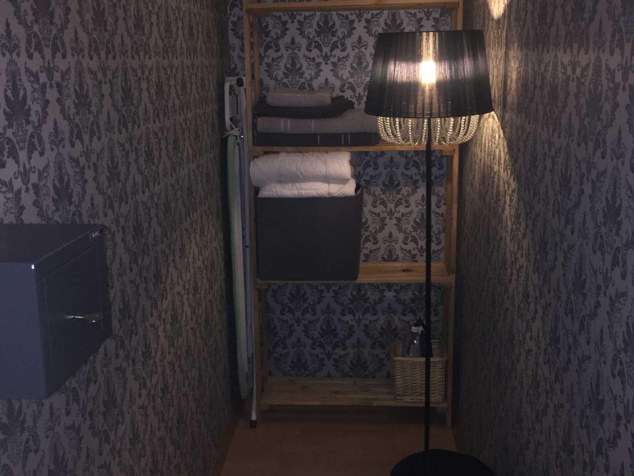 Zum Schlafzimmer auf der zweiten Etage gehört ein Ankleideraum mit ausreichend Platz, Ihre Kleidung und Gepäck unterzubringen sowie ein Tresor, Bügeleisen und Bügelbrett. Das Badezimmer mit WC, Dusche und Waschbecken bietet Ihnen außerdem die Möglichkeit, Waschmaschine und Trockner während Ihres Aufenthaltes kostenfrei zu nutzen.